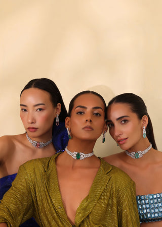 “Two expressions of timeless elegance: the Helena Choker in emerald green and in ruby pink. Sleek CZ bands meet regal gemstones, creating jewels that whisper grace yet radiate unmistakable power.”