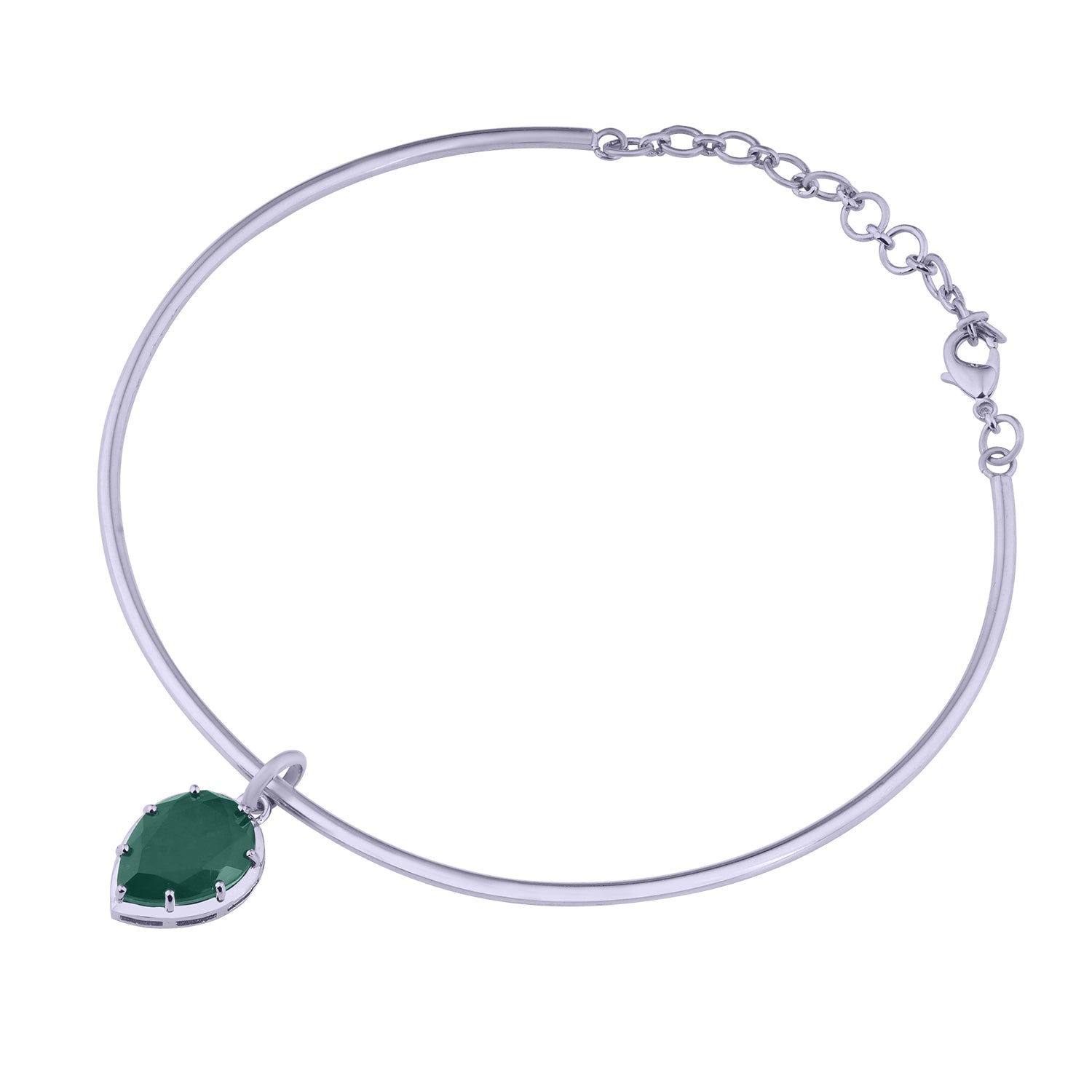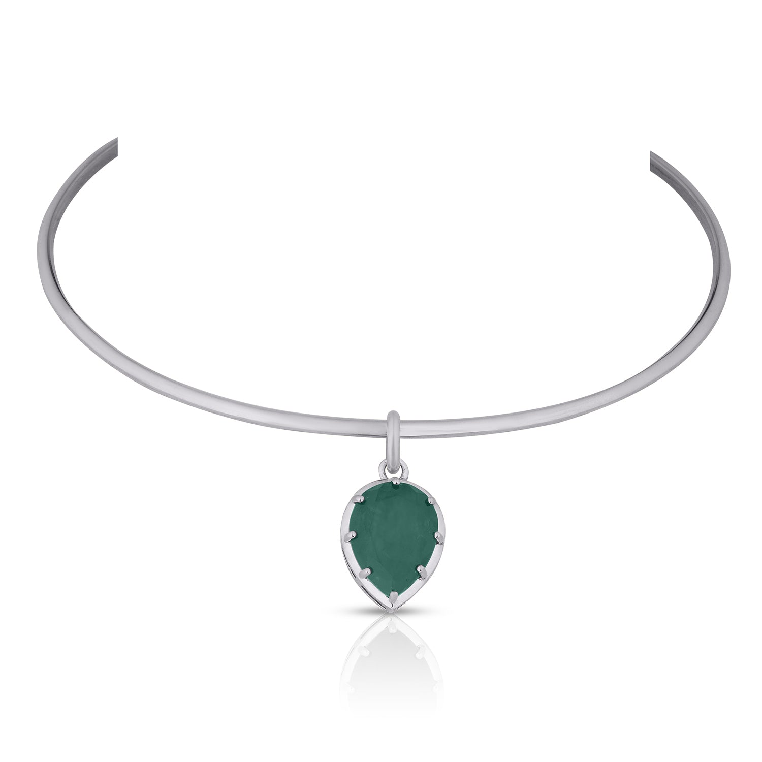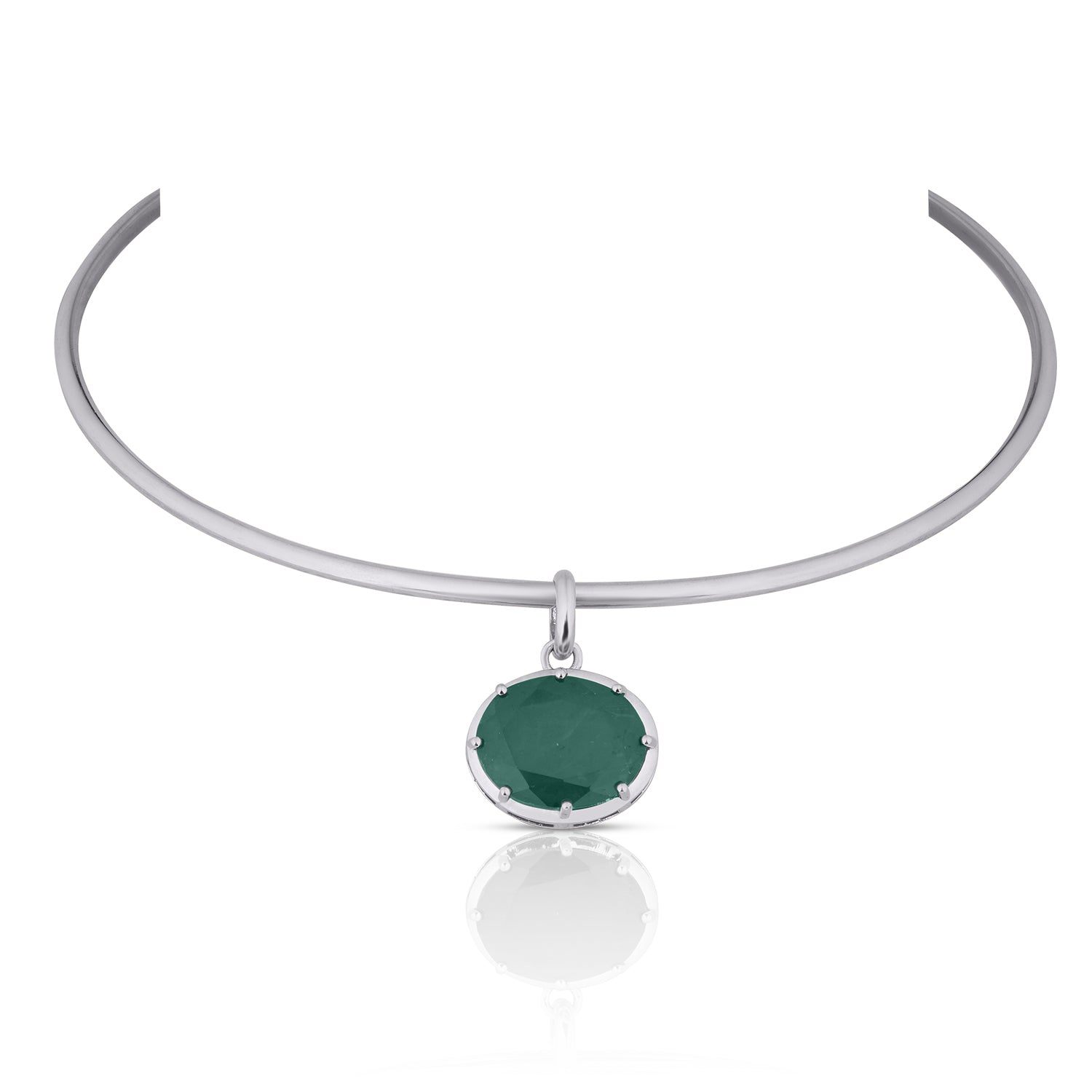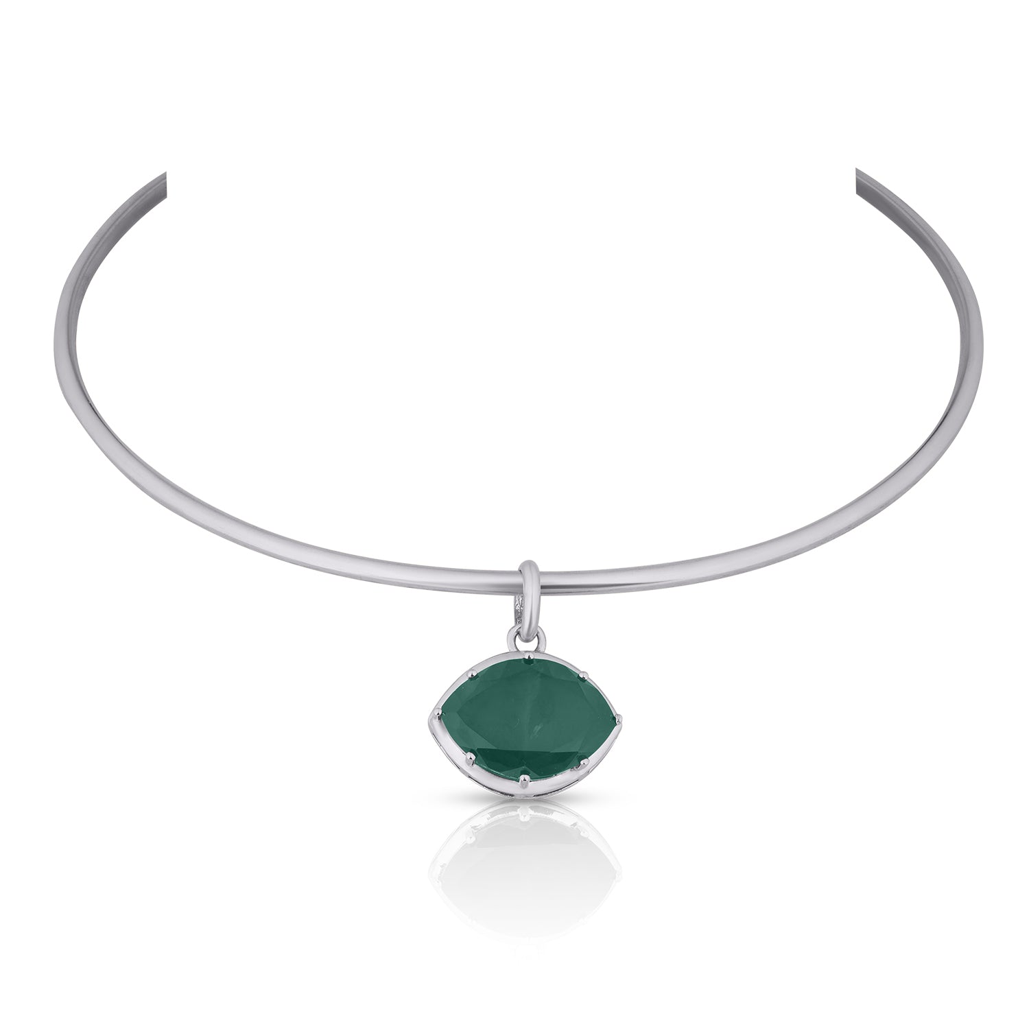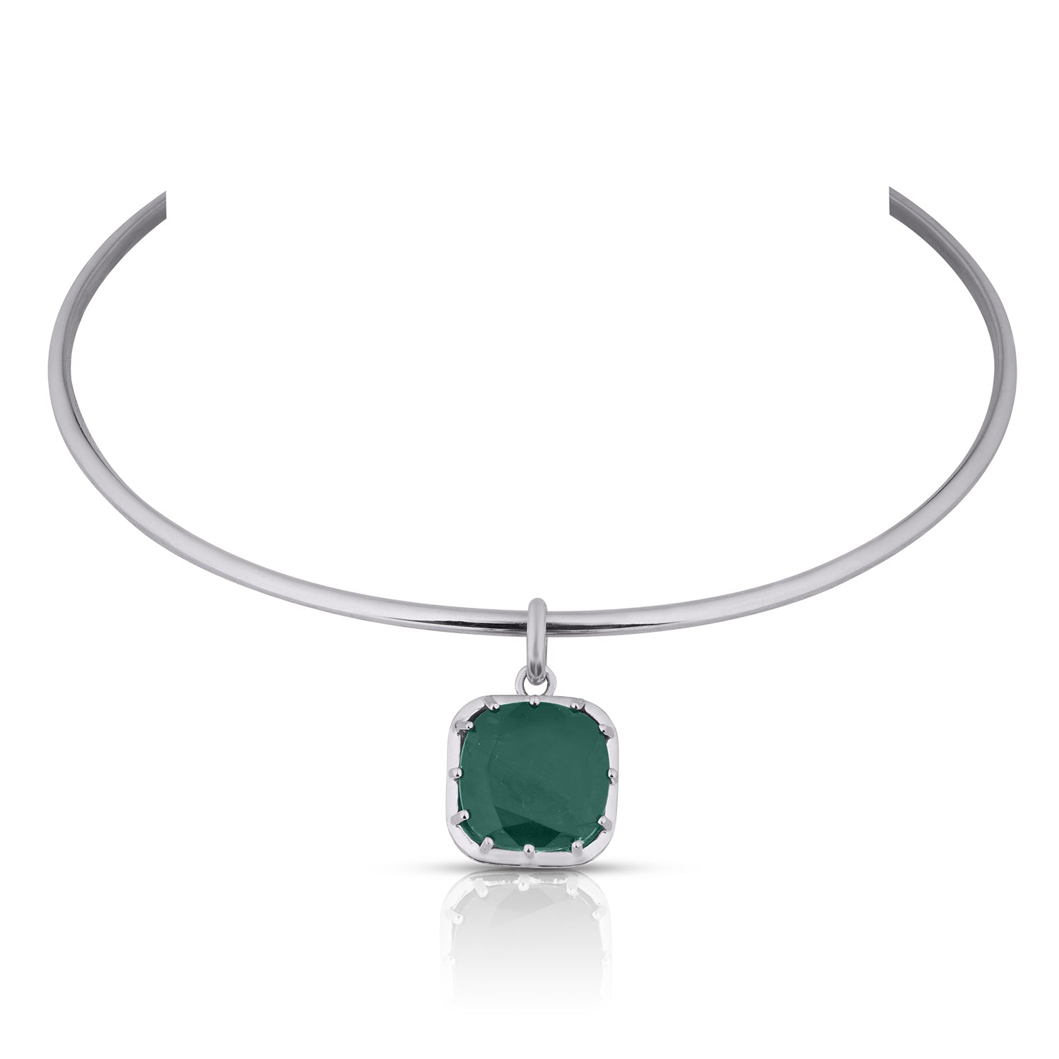 A sleek collar necklace featuring a cushion-cut green doublet stone suspended from a polished silver-tone band. Designed with a clean, modern silhouette, this statement choker sits beautifully on the neckline and adds a refined pop of colour. Perfect for elevating both day and evening looks.