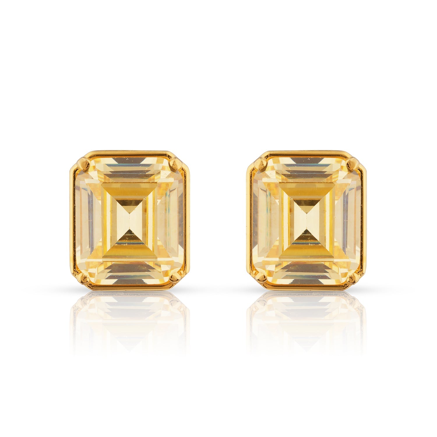 Emerald-cut golden crystal stud earrings designed with clean lines and a refined claw setting. The structured silhouette and warm tone make them perfect for elevating both everyday outfits and occasion wear. A modern classic with effortless polish.