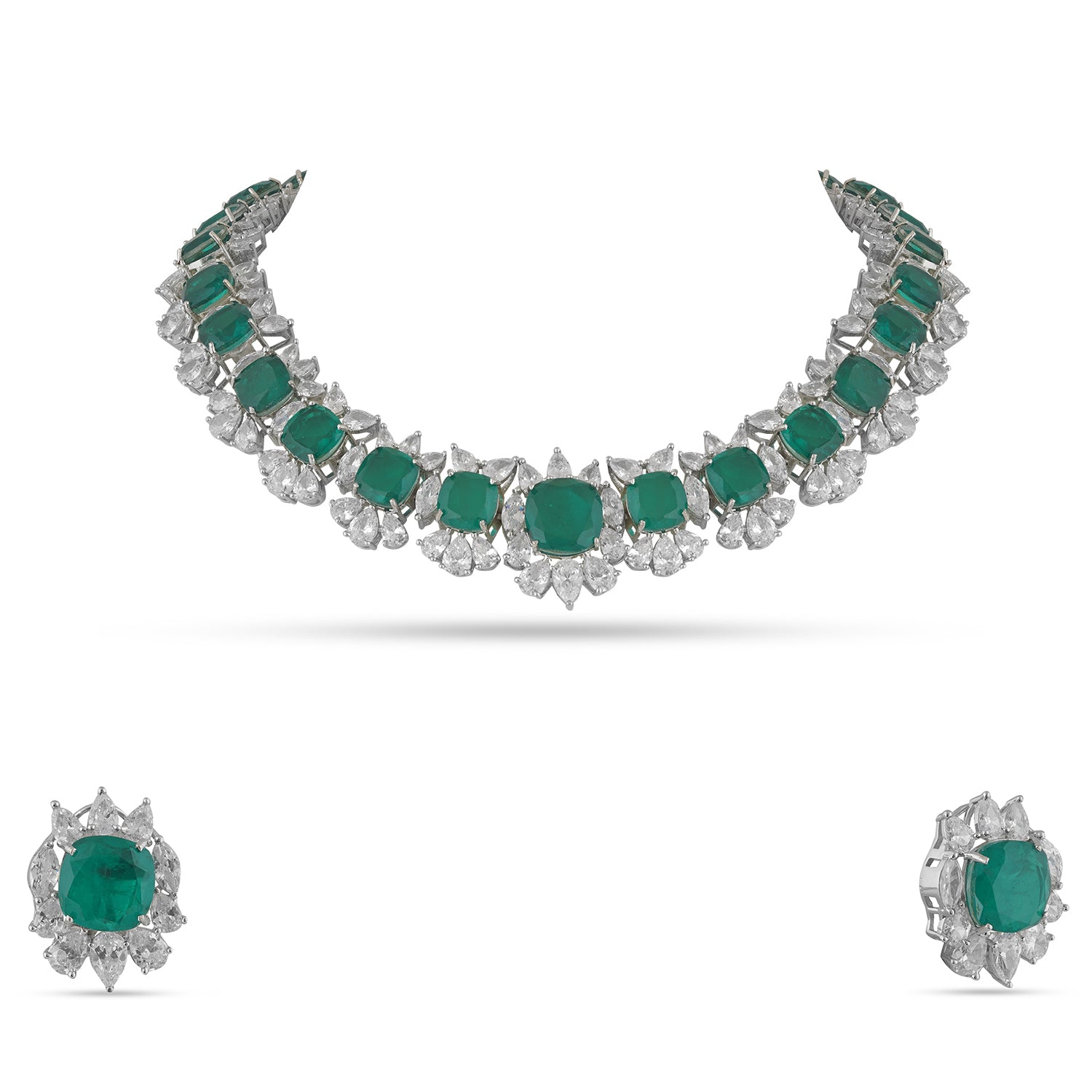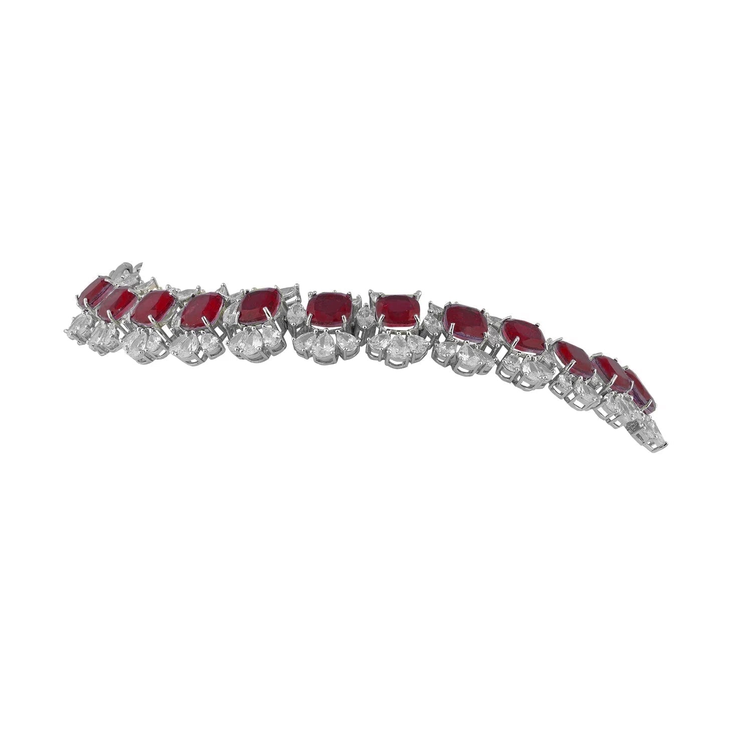 Indulge in the modern elegance of the Basaaria choker set. Handcrafted with delicate American diamonds and ruby red stones, this glamorous piece is perfect for special occasions.