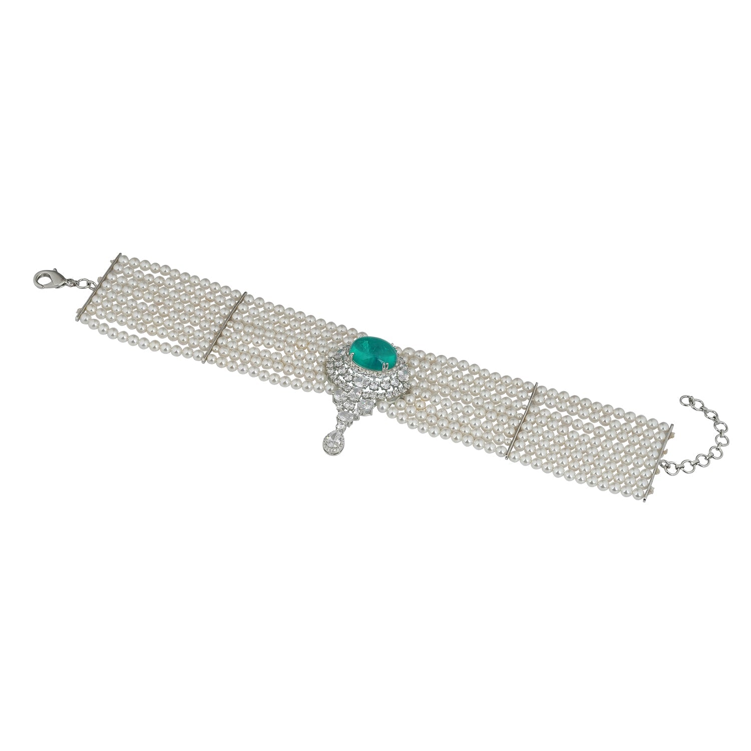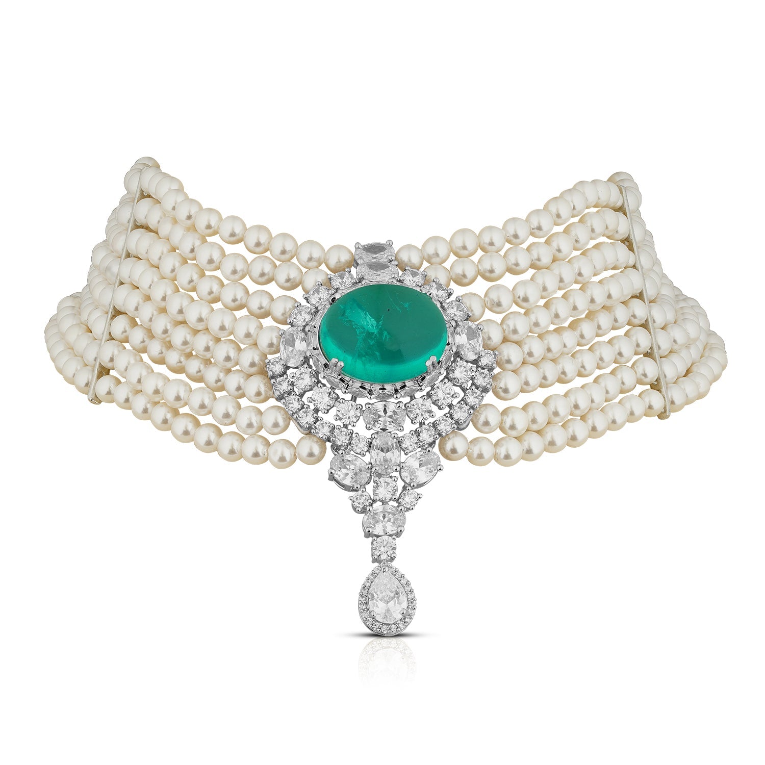 The Seraphina Choker Set is an ode to timeless sophistication. Rows of lustrous pearls come together in graceful harmony, creating a regal collar that embraces the neckline with vintage allure. At its heart lies a vivid oval emerald, encircled by a constellation of dazzling CZ stones, cascading into a teardrop accent that draws the eye with quiet drama.