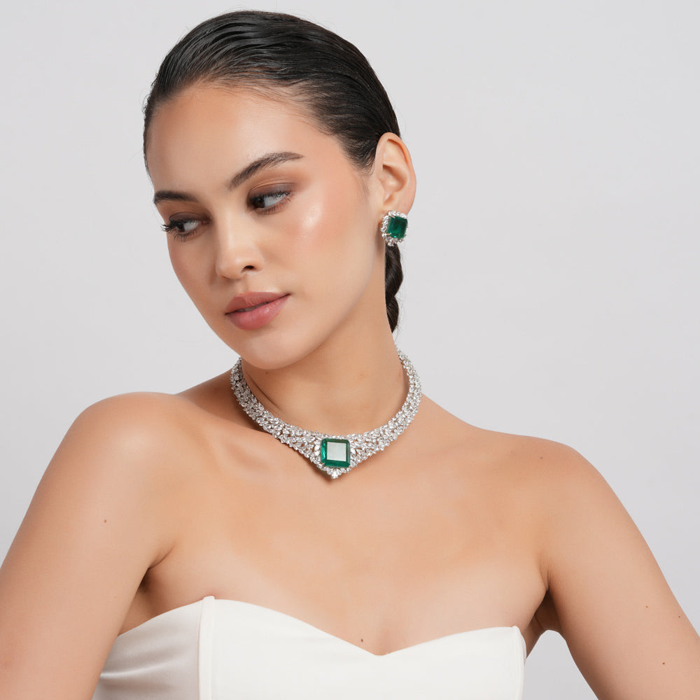 Look stunningly glam with this Ammarah necklace set! It features American diamond and an emerald green stone centre that will draw admiration from everyone around you. Shine bright like a diamond!