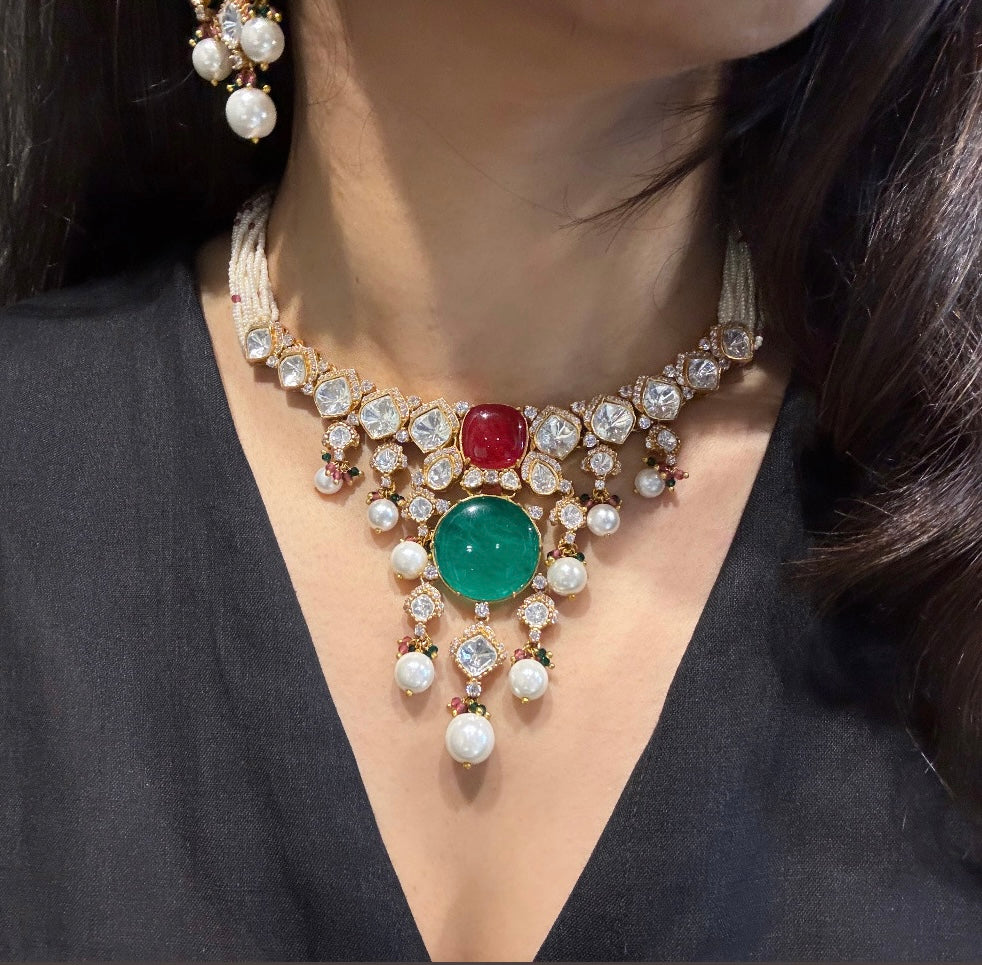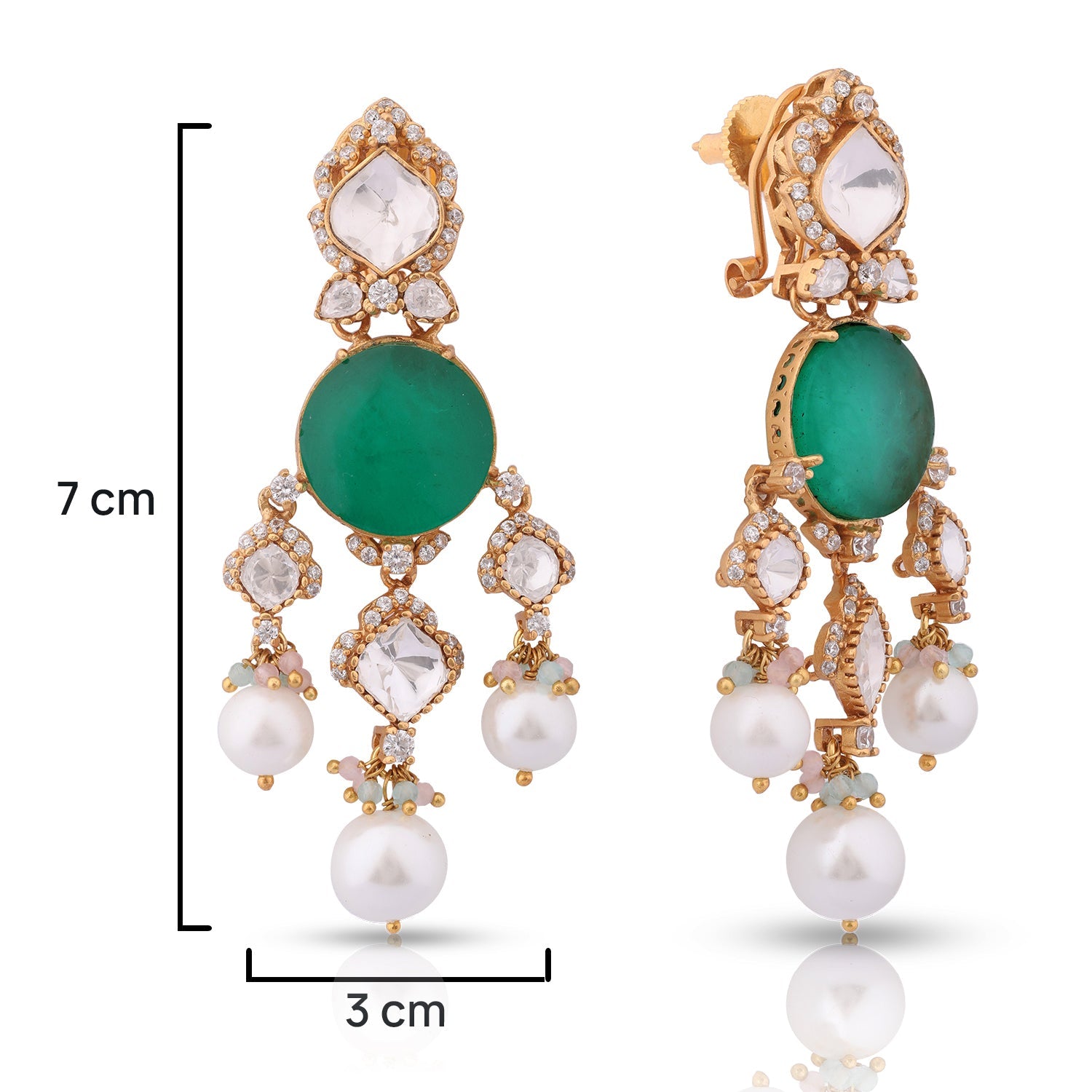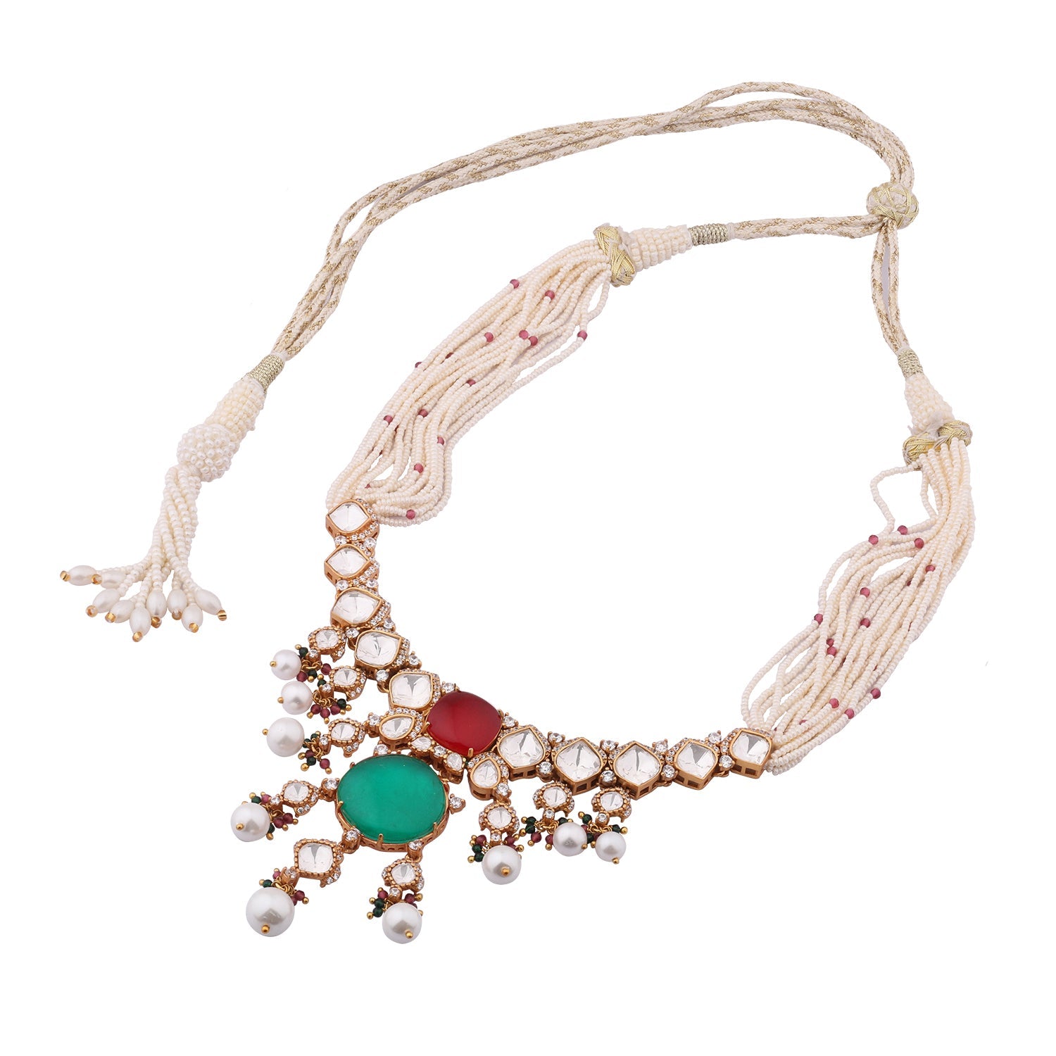 This elegant sea green stone necklace set features intricate polki and delicate pearl drops. The perfect addition to any outfit, this set exudes sophistication and charm. Elevate your style with Eira - the ideal accessory for any occasion.