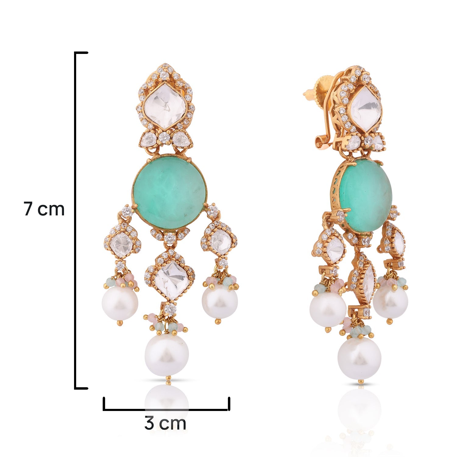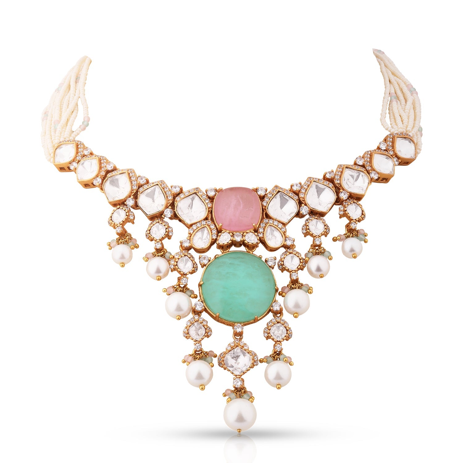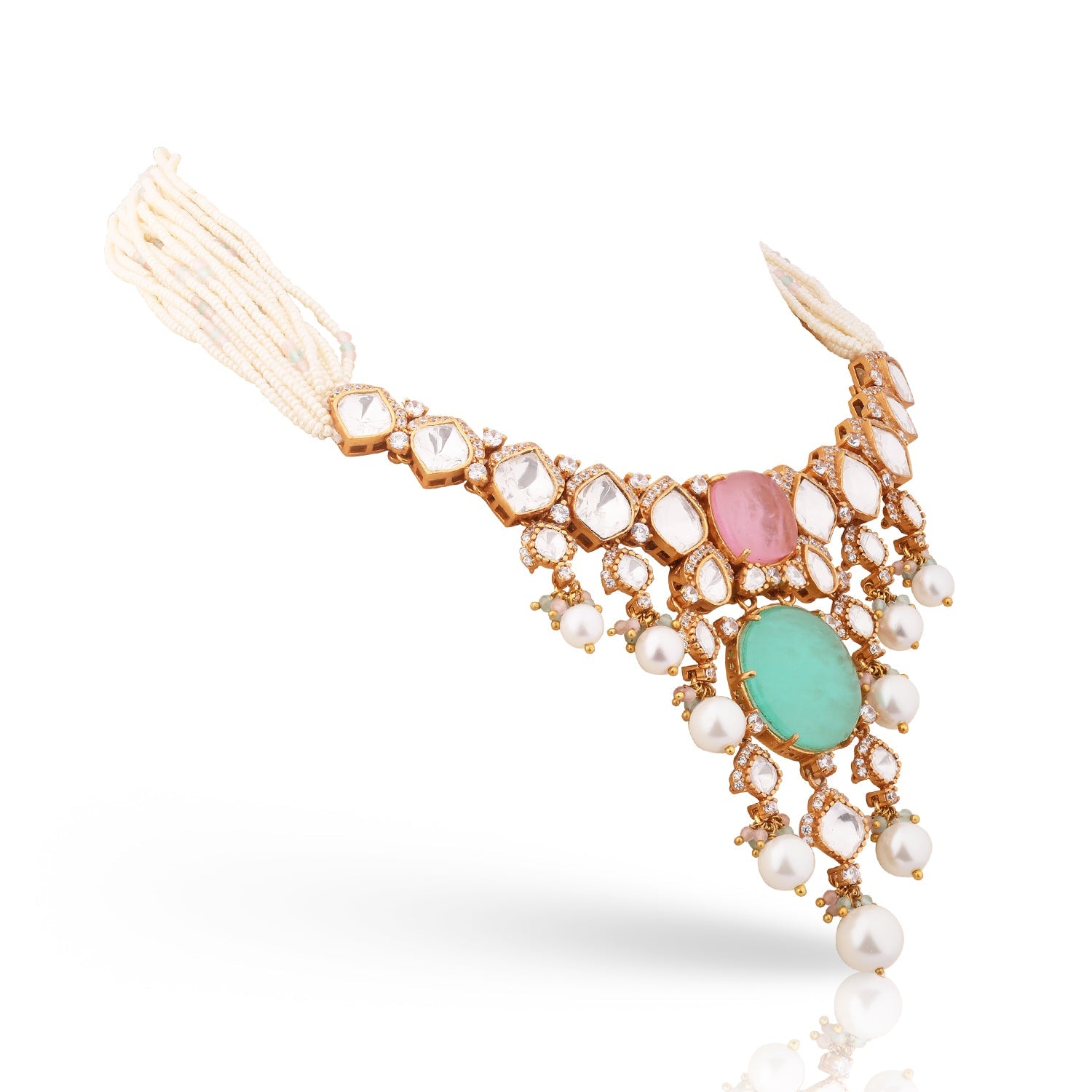 This elegant mint green stone necklace set features intricate polki and delicate pearl drops. The perfect addition to any outfit, this set exudes sophistication and charm. Elevate your style with Eira - the ideal accessory for any occasion.