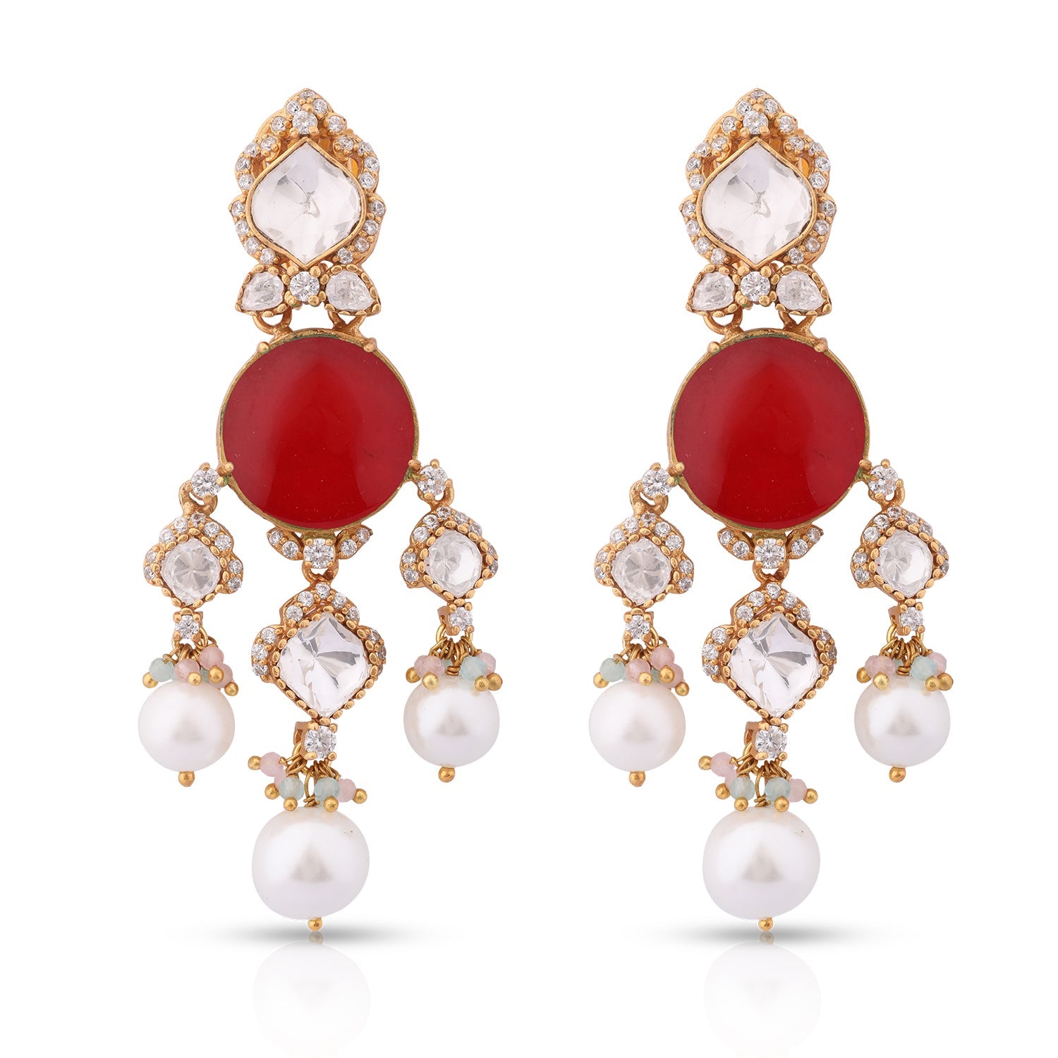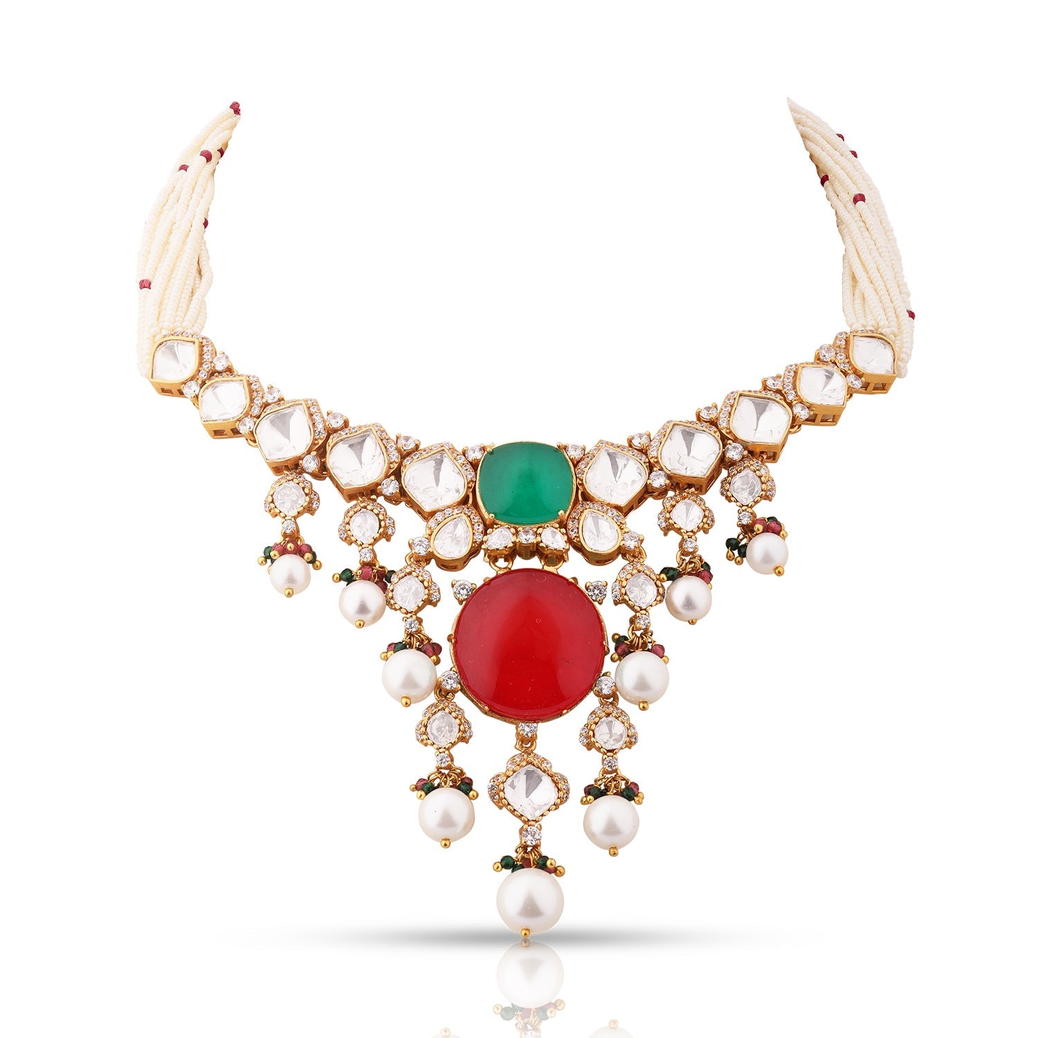Add a touch of glamour to your outfit with Eira's red doublet necklace set. The stunning red stones are complemented by delicate polki and pearl drops, making this the perfect piece for any occasion. Elevate your style and make a statement with this unique necklace set.