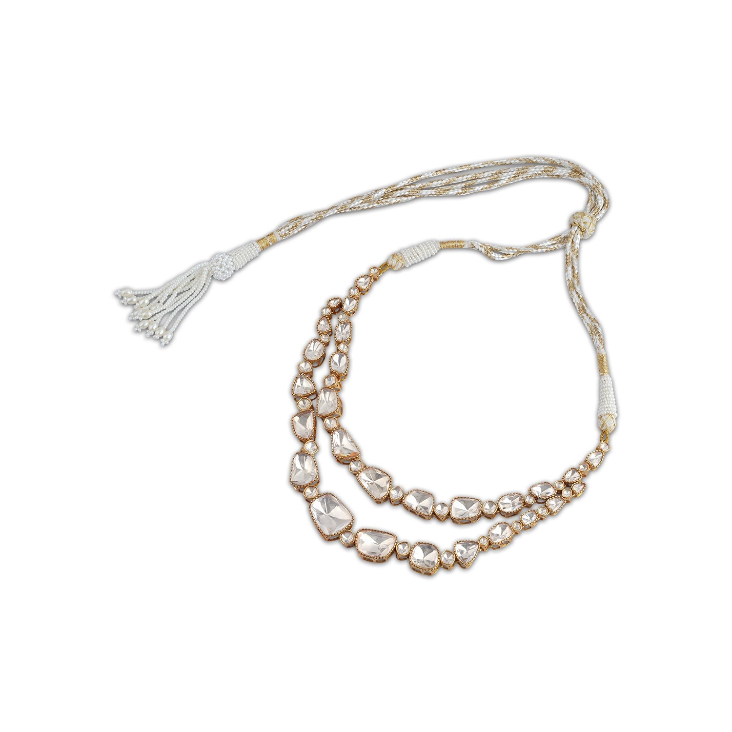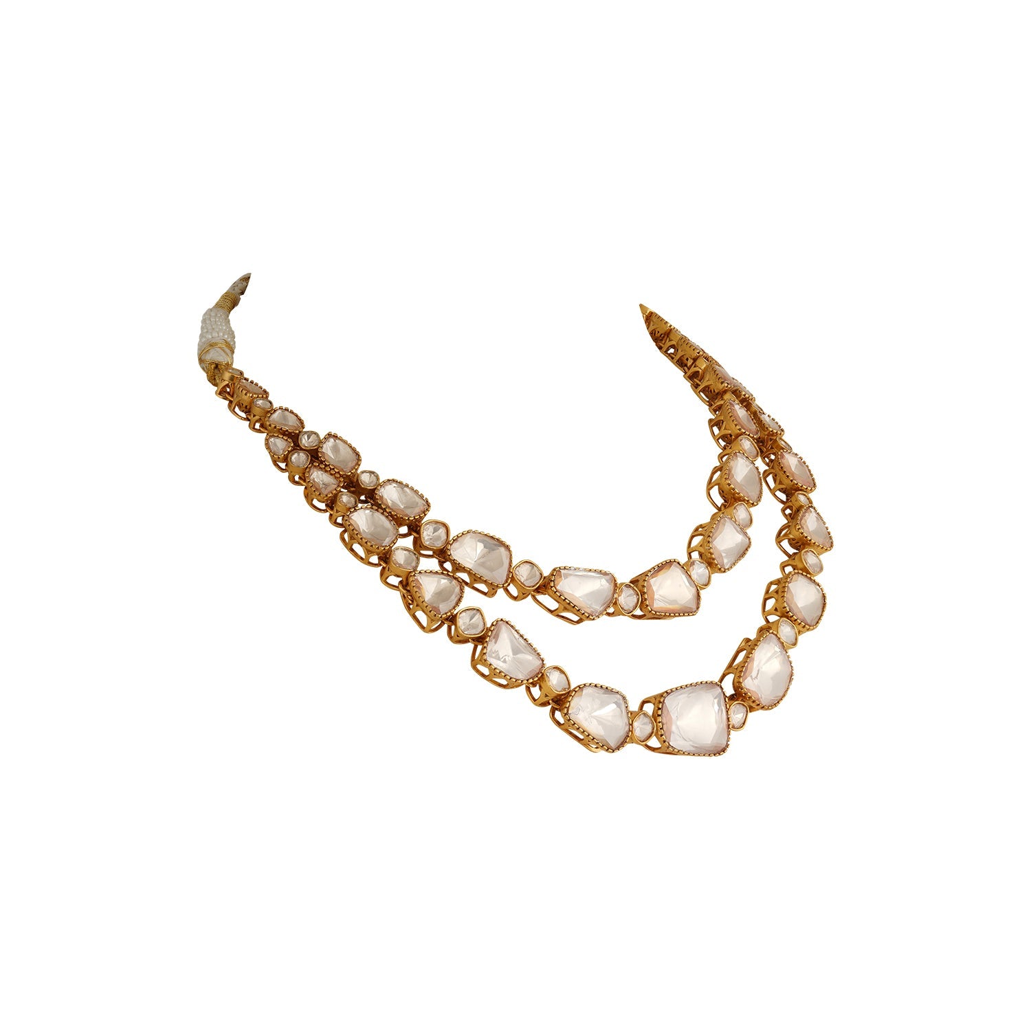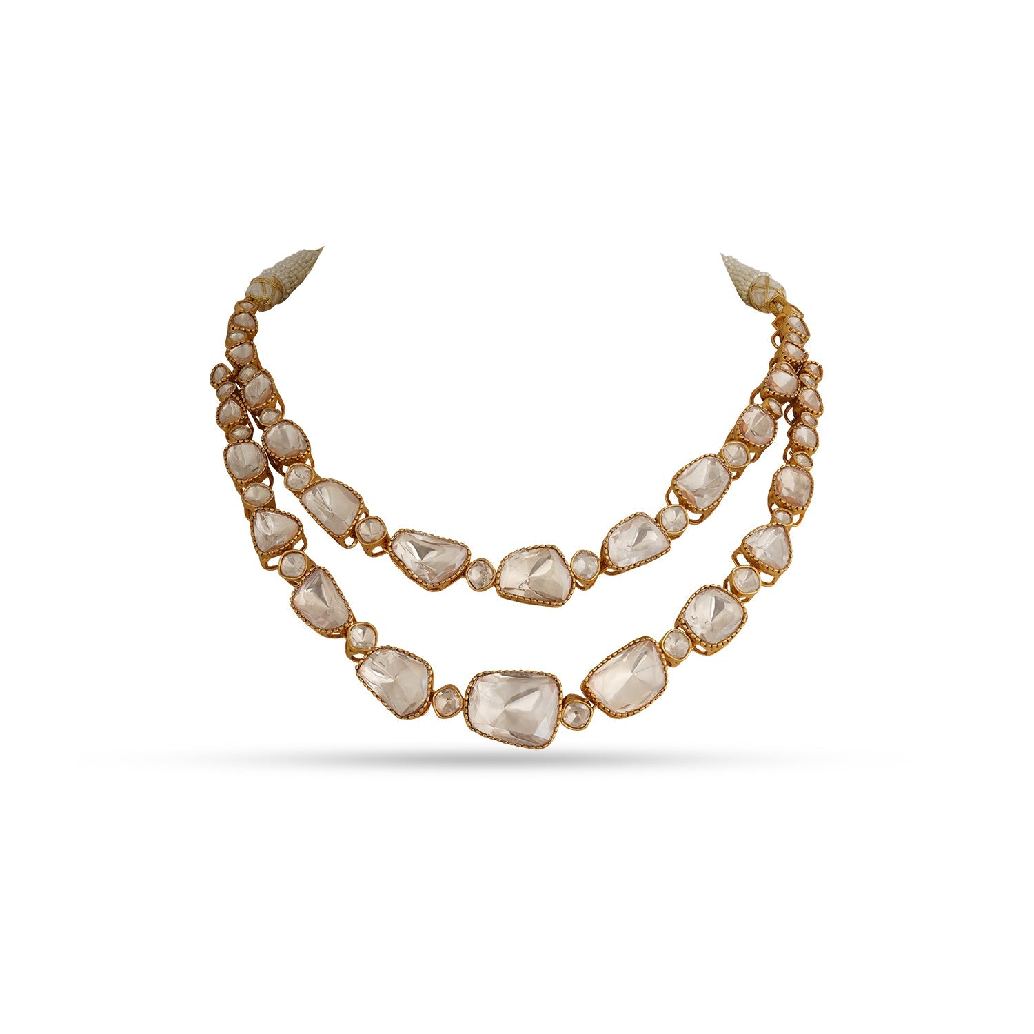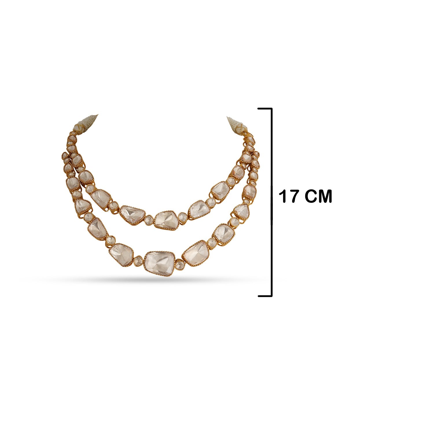 Add a touch of elegance with the Mahek double layer polki necklace set. This set includes a stunning necklace with two layers of intricate polki designs and matching earrings. Complete any outfit with this versatile set that radiates style and sophistication.