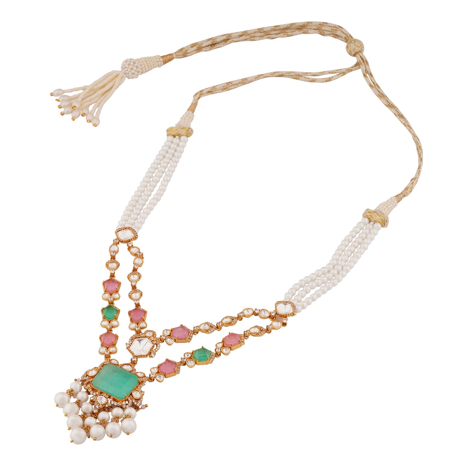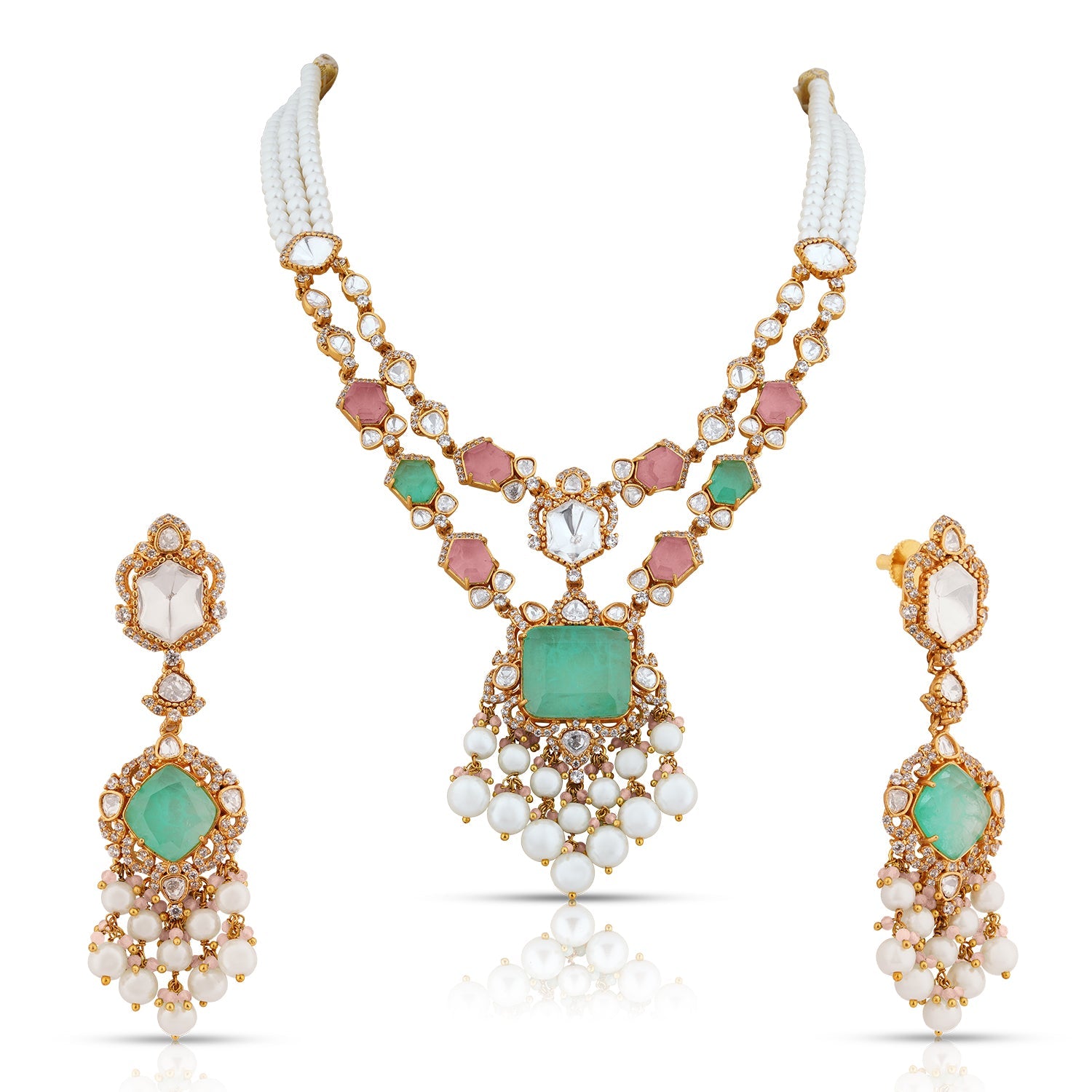 A symphony of color and tradition, this necklace set features a mix of pastel pink and green polki stones, set in a radiant gold-tone frame with embedded crystals. The central pendant is adorned with lustrous pearl drops, echoing regal Mughal-inspired design. Comes with a pair of statement earrings to complete the look.