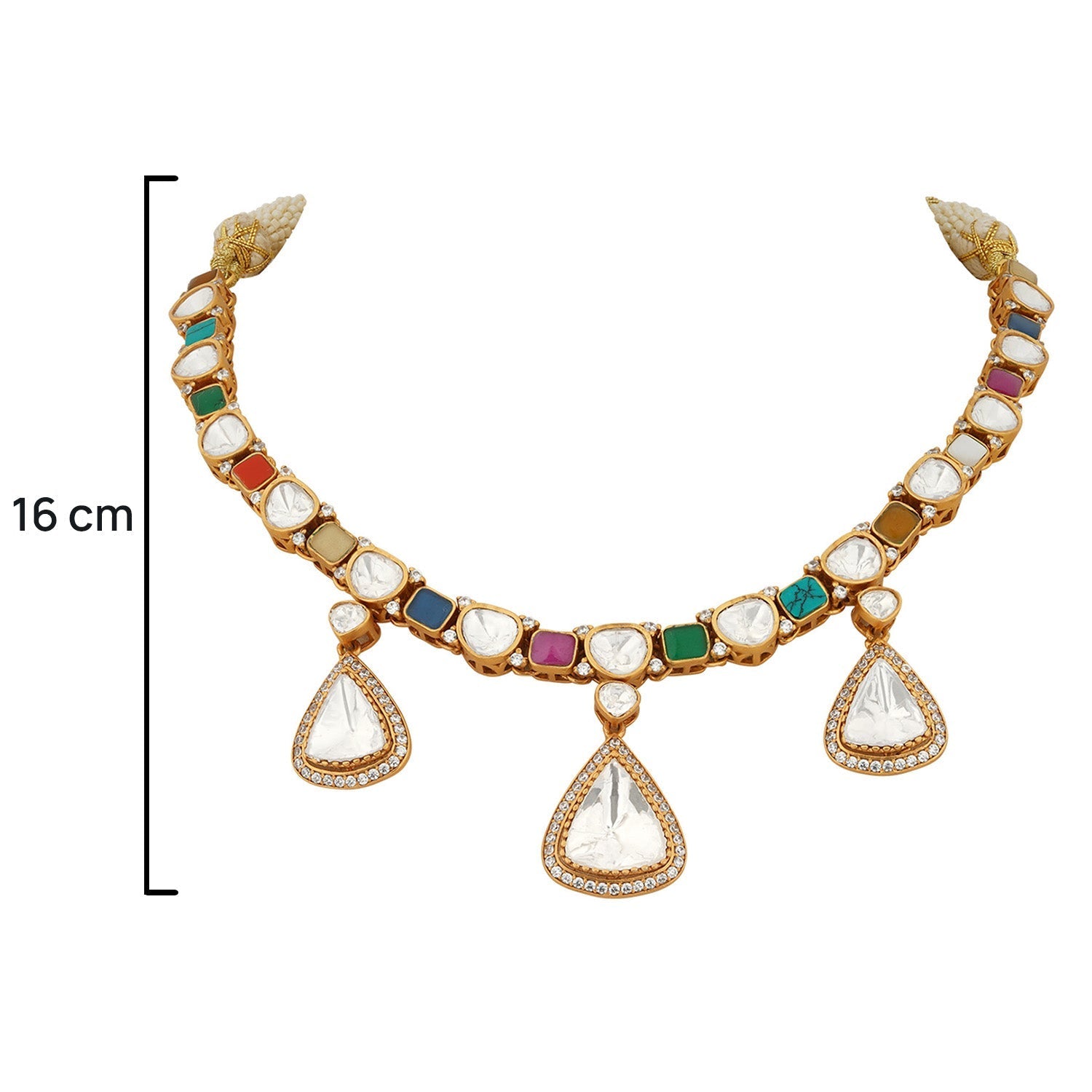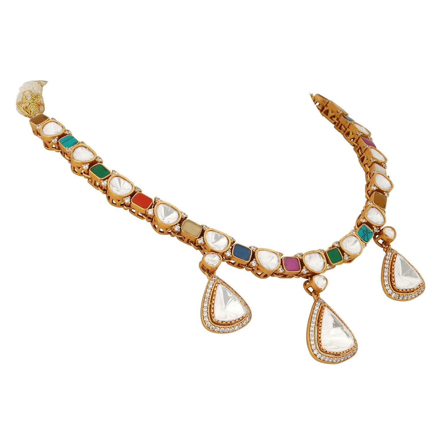 The Samaira Necklace Set exudes elegance with its stunning design and intricate details. Featuring muti-coloured stones and shimmering drops, this set is perfect for weddings, festive celebrations, or glamorous evenings.