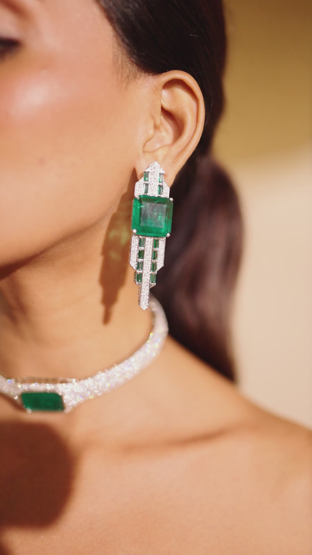 The Alice Drop Earrings capture the spirit of Art Deco elegance, where geometry meets glamour. At their heart rests a bold emerald-cut stone, framed by cascading baguette greens and CZ brilliance. The sharp lines and architectural silhouette speak of strength, while the deep green hue carries whispers of mystery and timeless allure.
