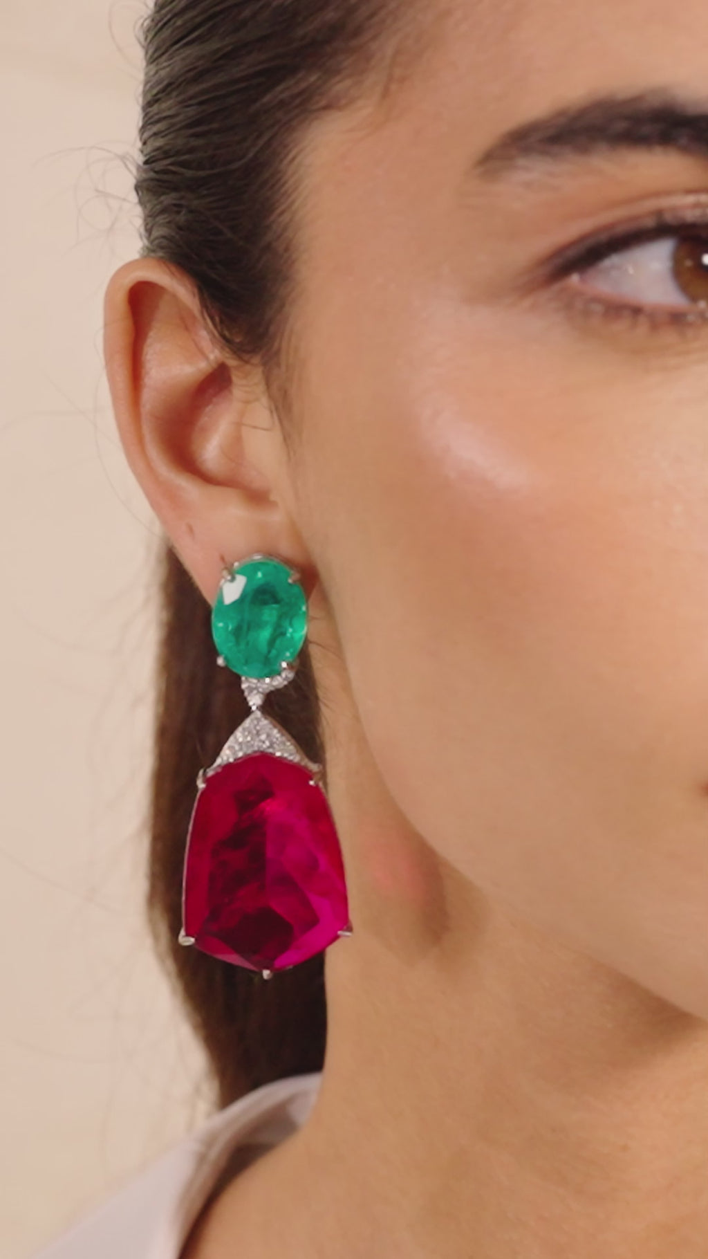 The Ava Dangle Earrings are a bold play of contrast and color. An oval aqua-hued stone crowns the design, flowing into a striking ruby-toned drop, with a shimmer of CZ stones adding subtle brilliance in between. The faceted cuts catch the light with every move, creating a look that is both dramatic and effortlessly refined.