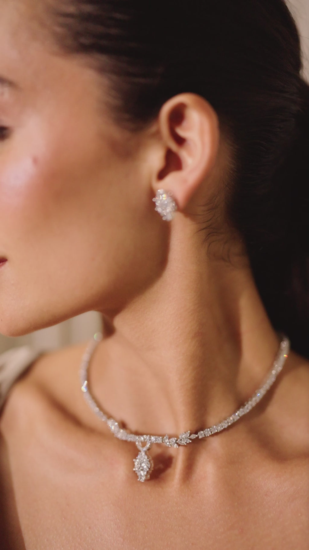 The Azura Choker is elegance woven in brilliance. A delicate line of CZ stones flows around the neckline, accented with leaf-like clusters that add texture and grace. At its center, a floral-inspired pendant shimmers with radiance, echoing the design of its matching stud earrings for a complete and timeless set.