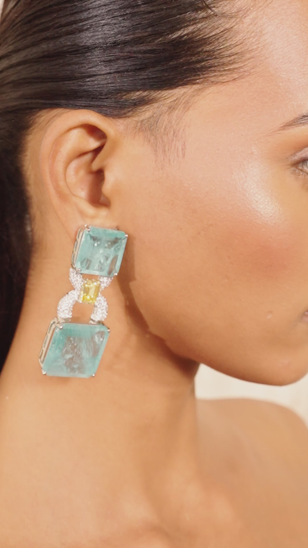 The Emily Dangle Earrings unfold like a symphony of color and contrast. Gentle aqua stones, cut in bold squares, bring with them the serenity of water and sky, while a golden emerald-cut stone glimmers in the center — a warm burst of sunlight framed in brilliance. The delicate pavé link ties the elements together, creating a balance between softness and strength.