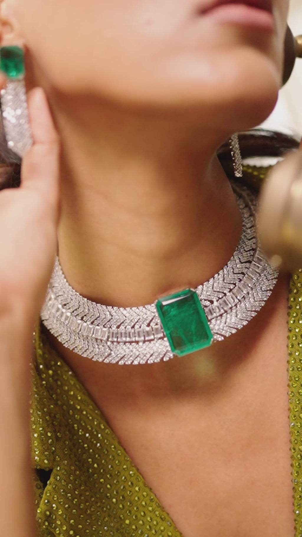 The Freya Necklace Set is an ode to regality — a creation that captures the grandeur of ancient queens and the timeless power of emeralds. At its core lies a majestic emerald-cut green stone, exuding vitality and depth, embraced by sweeping rows of baguette and pavé-set CZ stones that shimmer like woven constellations.