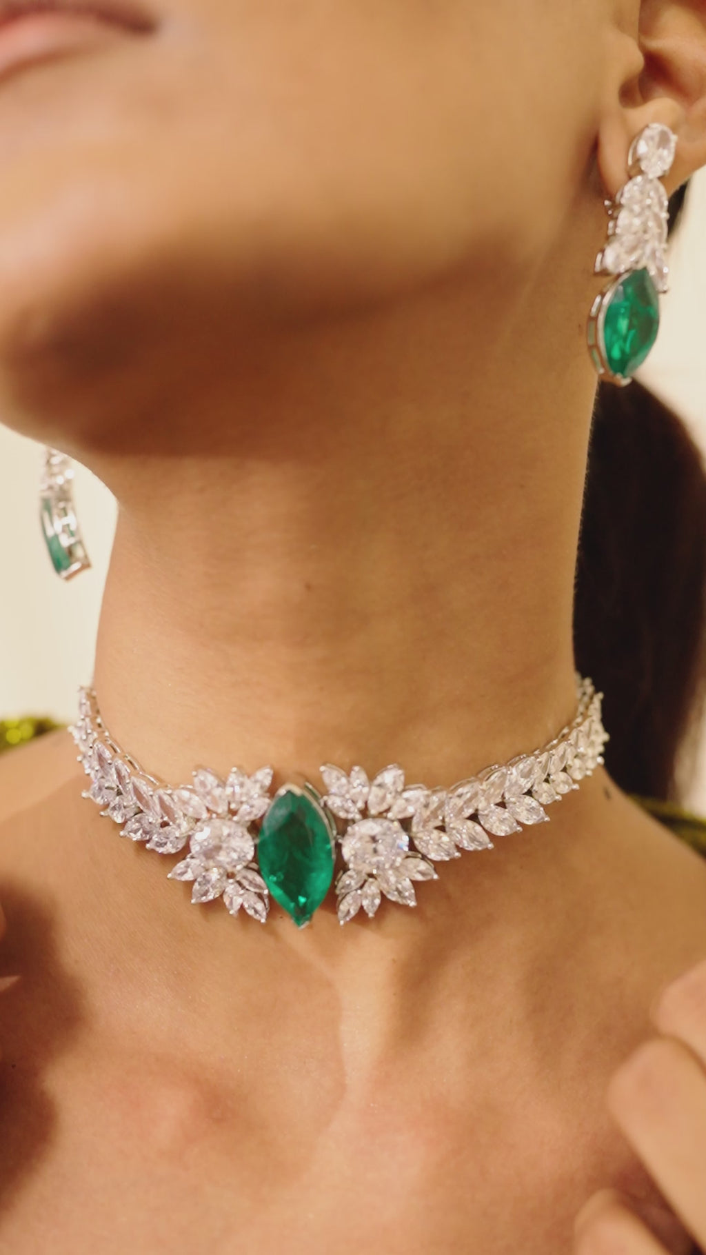 Emerald fire meets crystalline brilliance in the Juliet Choker—an exquisite harmony of depth and light. At its center gleams a marquise-cut emerald stone, regal and magnetic, framed by a constellation of leaf-set CZ crystals that shimmer like frost in moonlight. The band, adorned with graduated brilliance, wraps gracefully around the neck, striking a balance between drama and refinement.