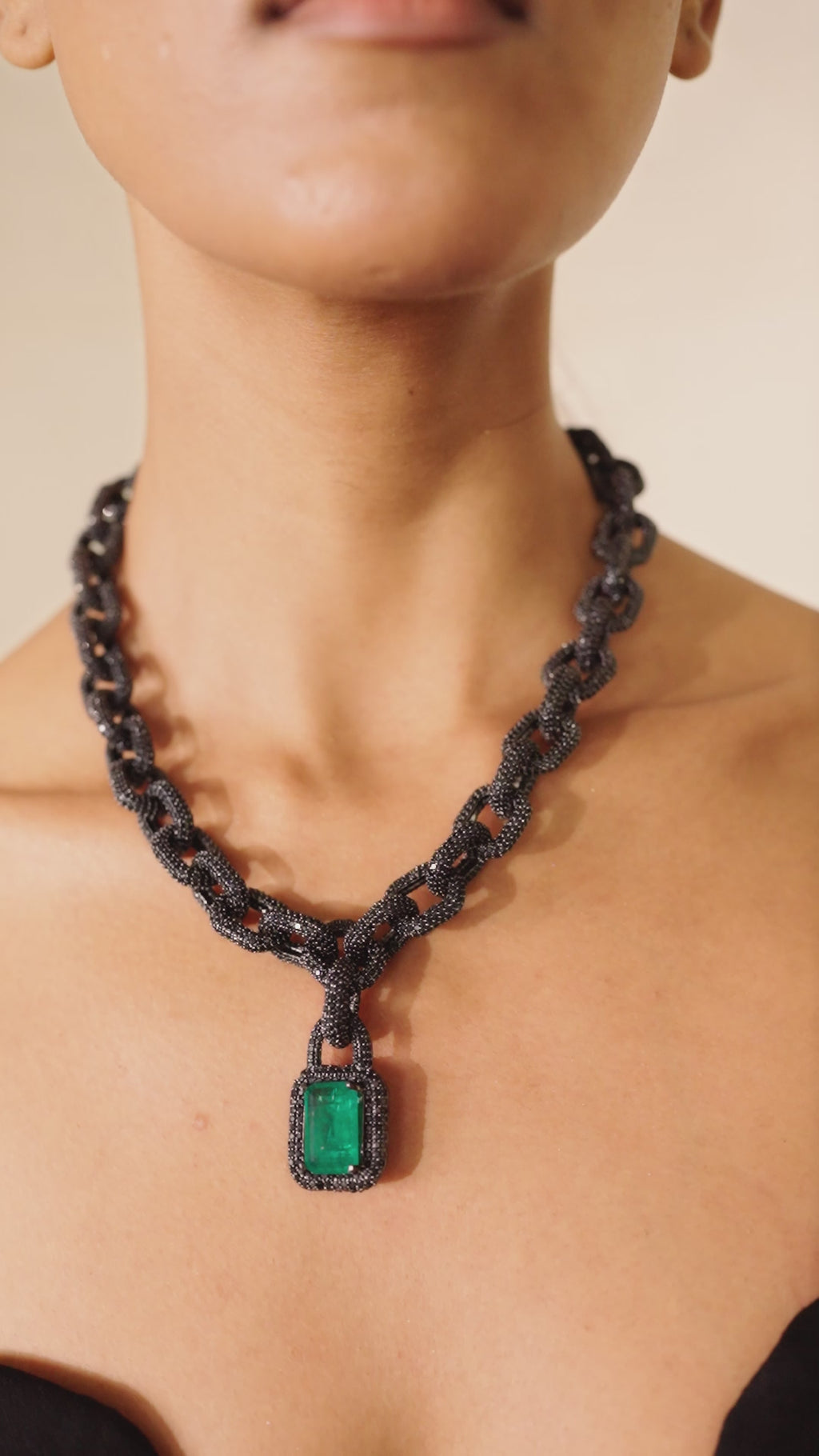 The Karina Necklace is bold poetry cast in shimmering links. Dark, crystal-encrusted chains form a sculptural rhythm, anchoring a striking emerald-hued stone at its heart. Fierce yet refined, it embodies the power of contrast—mystery entwined with brilliance, strength softened by elegance.