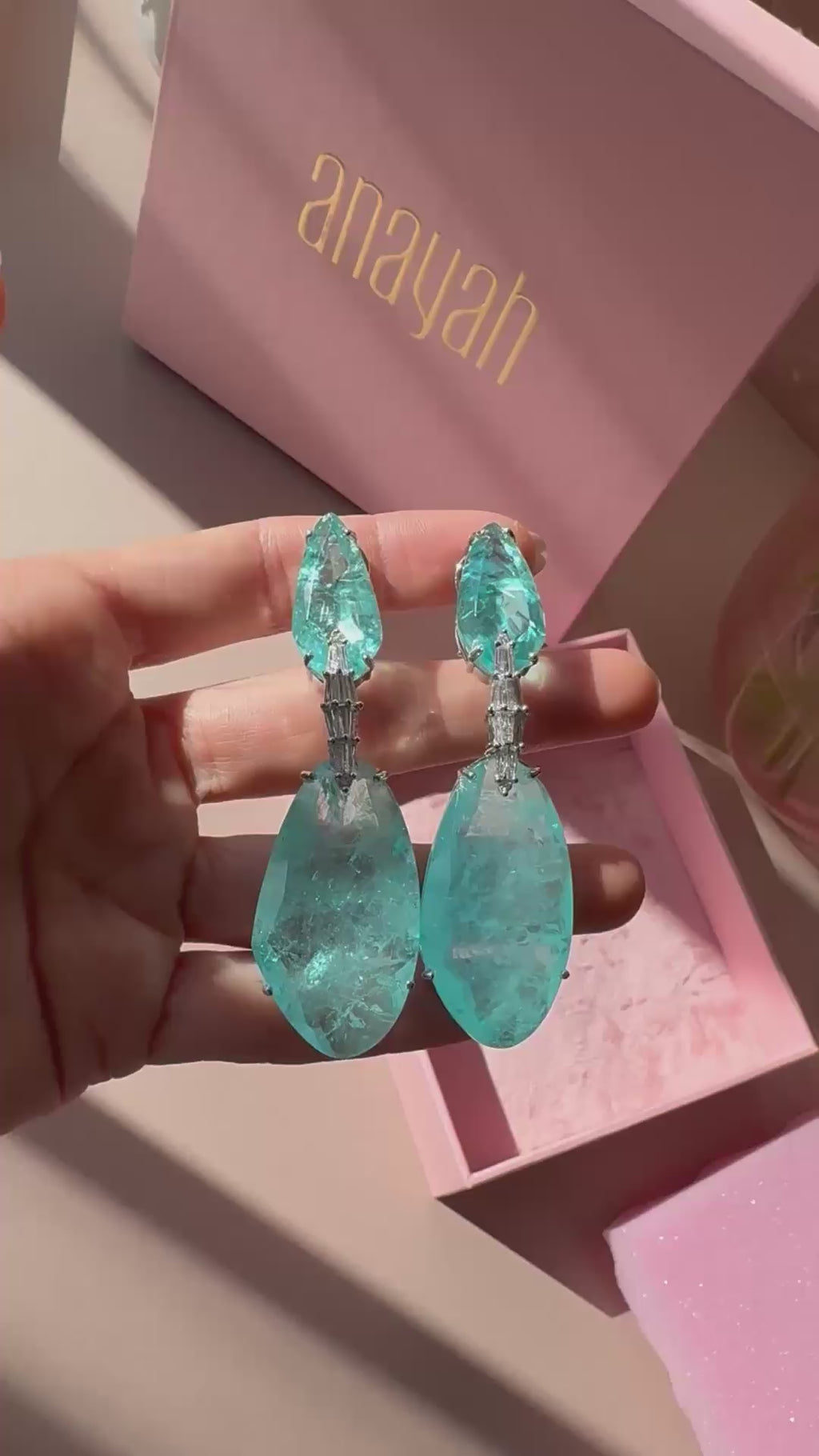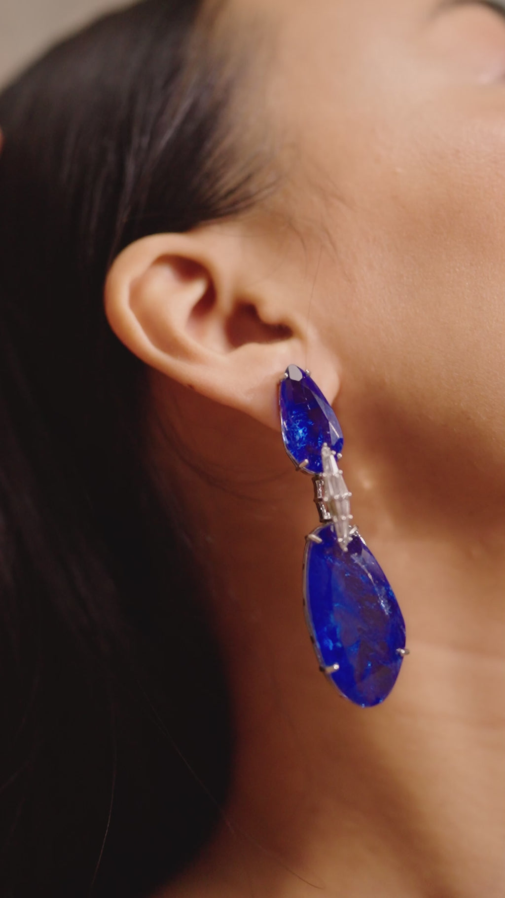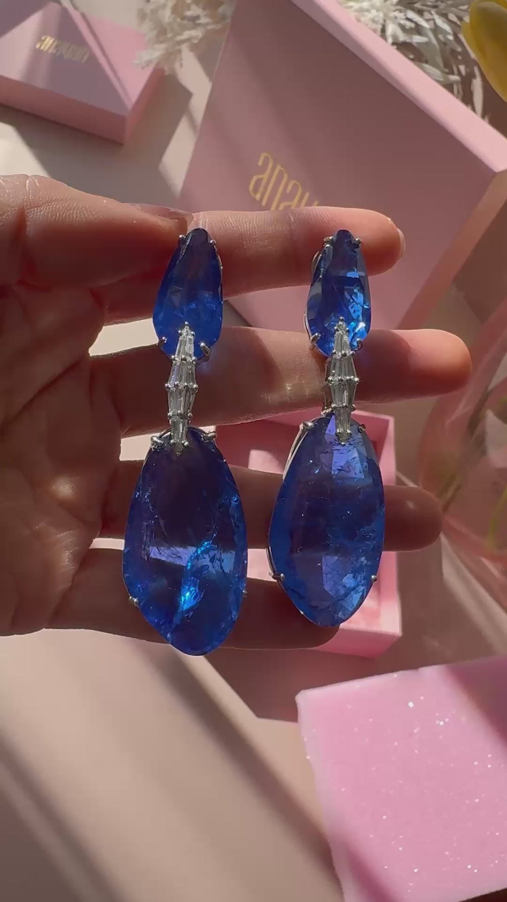 Like fragments of a twilight sky captured in stone, the Lucy Earrings in blue radiate a serene yet powerful allure. The elongated pear-shaped drops mirror the flow of cascading water, while the baguette-cut CZ accents add a whisper of starlight in between.