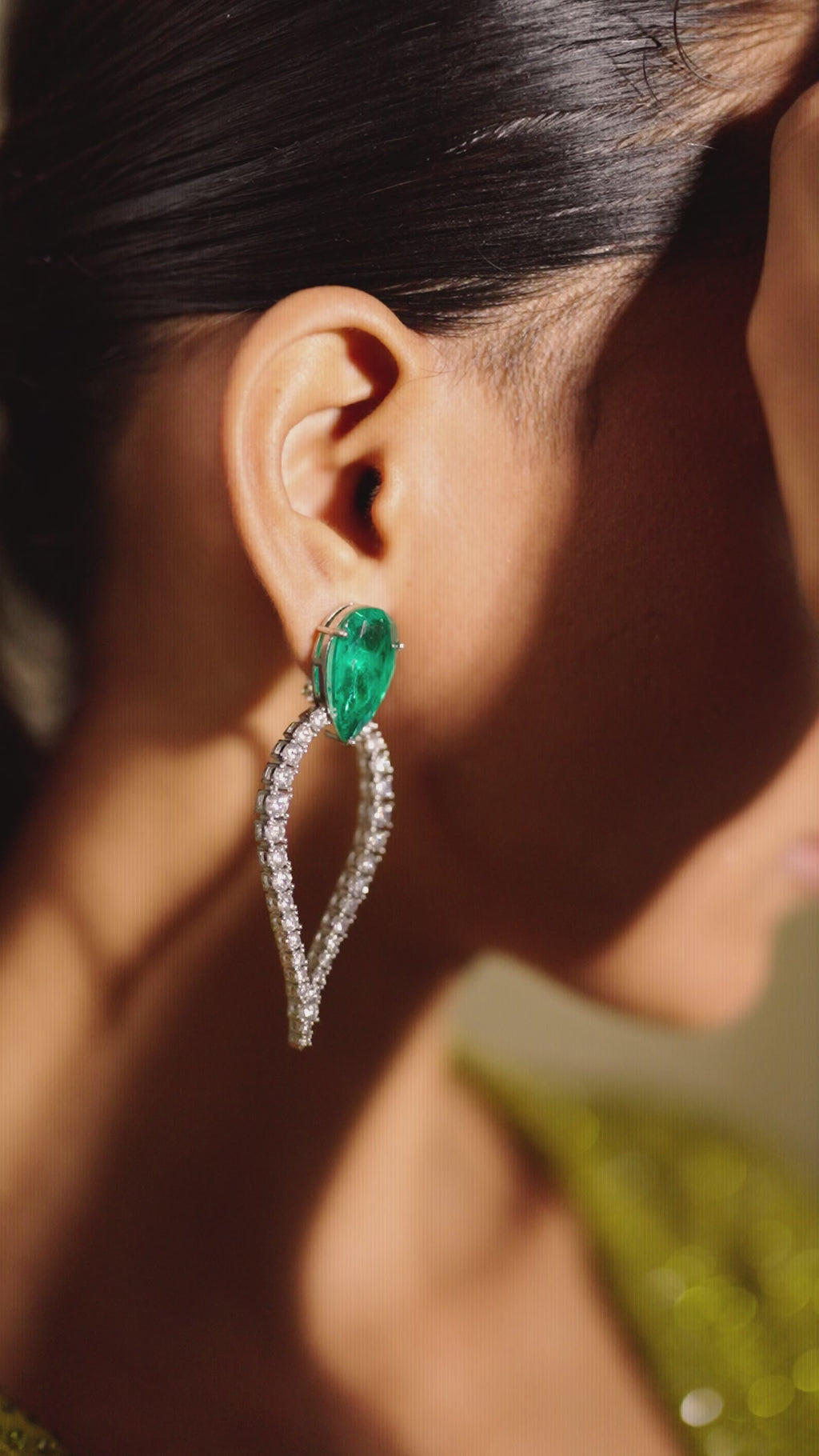 The Maya Drop Earrings in emerald green are a vision of elegance and bold allure. A pear-cut emerald-hued stone crowns the design, leading into a delicate cascade of CZ stones that form a graceful teardrop silhouette. The combination of vibrant green and shimmering brilliance creates a look that is both striking and timeless.