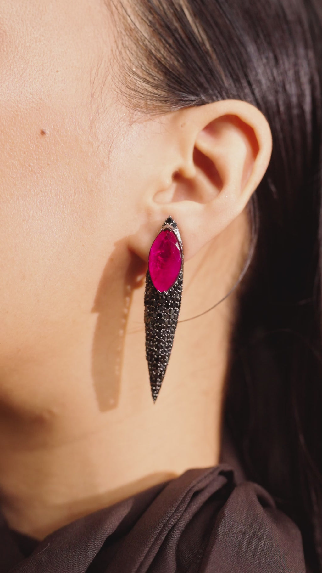 The Meher Earrings are a fearless statement of modern glamour. A vivid marquise-cut ruby-hued stone takes center stage, set against a cascade of black and gunmetal CZ stones that taper into a sleek, elongated silhouette. The contrast of fiery color and dark shimmer creates a piece that is dramatic, edgy, and unforgettable.