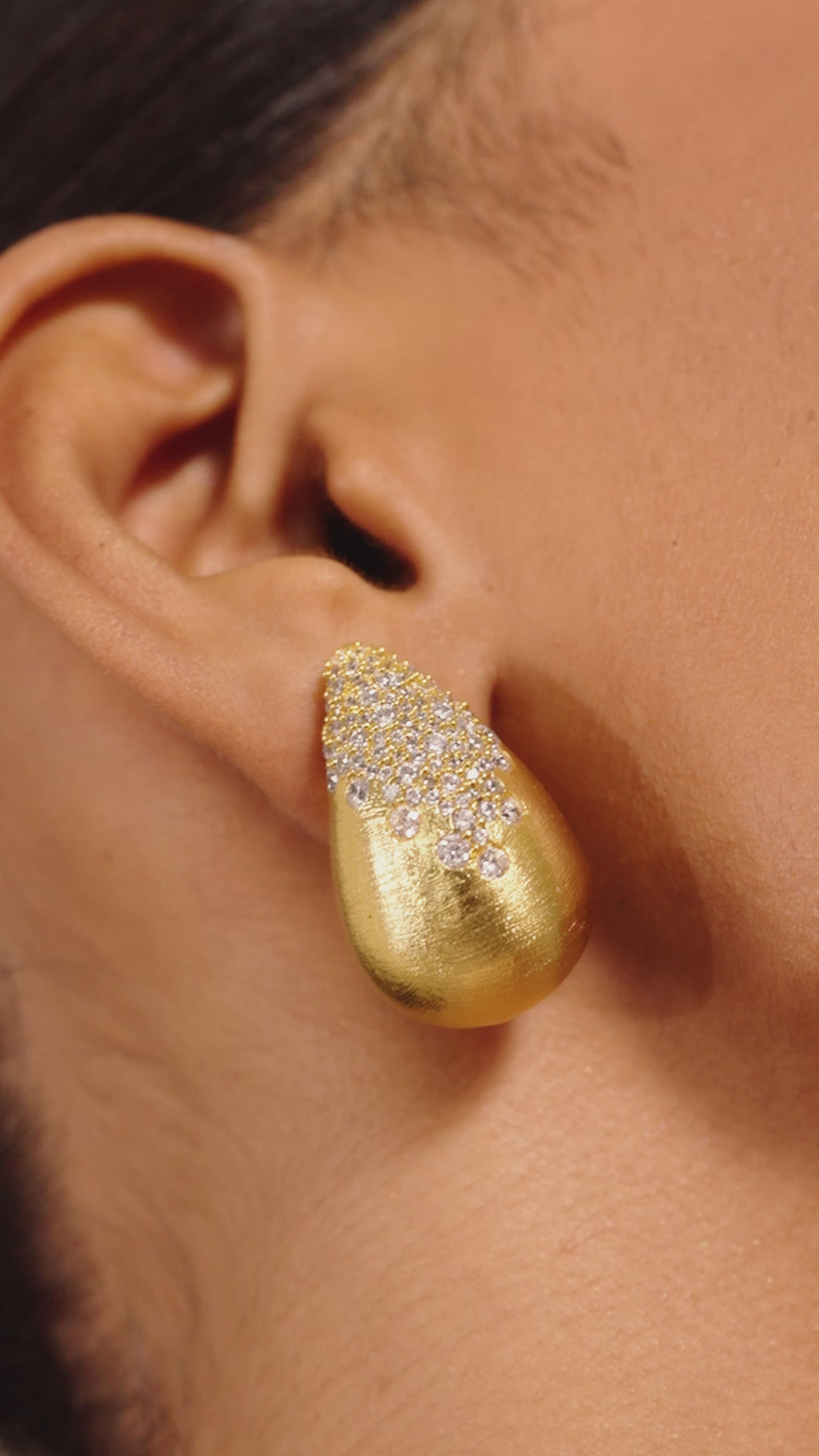 Like droplets of molten gold kissed by stardust, the Rhea Stud Earrings embody quiet glamour. Their sculptural teardrop form is brushed in a soft matte finish, crowned with a cascade of CZ stones that glimmer like falling constellations. The play of texture and light makes them as modern as they are timeless.
