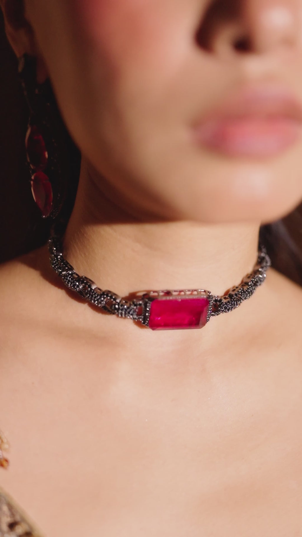 Bold yet refined, the Yaz Choker is designed to make a statement. At its center rests a striking rectangular ruby-hued stone, its vibrant depth framed by a band of dark, CZ-studded links. The contrast between the rich crimson and the midnight shimmer creates an unmistakably powerful silhouette.