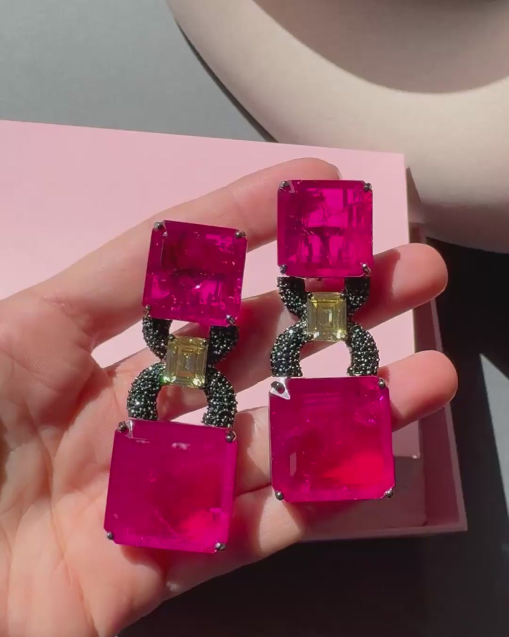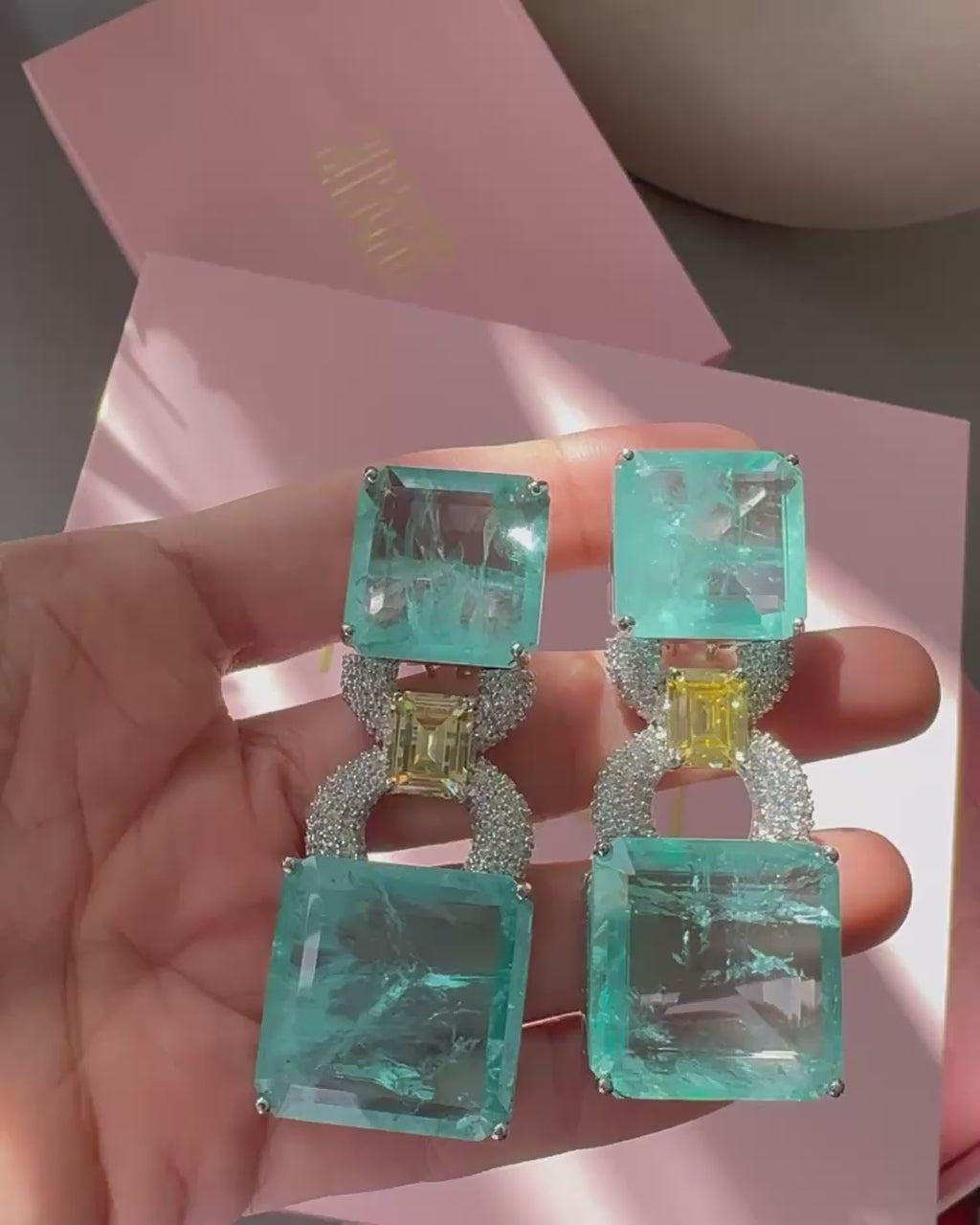 The Emily Dangle Earrings unfold like a symphony of color and contrast. Gentle aqua stones, cut in bold squares, bring with them the serenity of water and sky, while a golden emerald-cut stone glimmers in the center — a warm burst of sunlight framed in brilliance. The delicate pavé link ties the elements together, creating a balance between softness and strength.