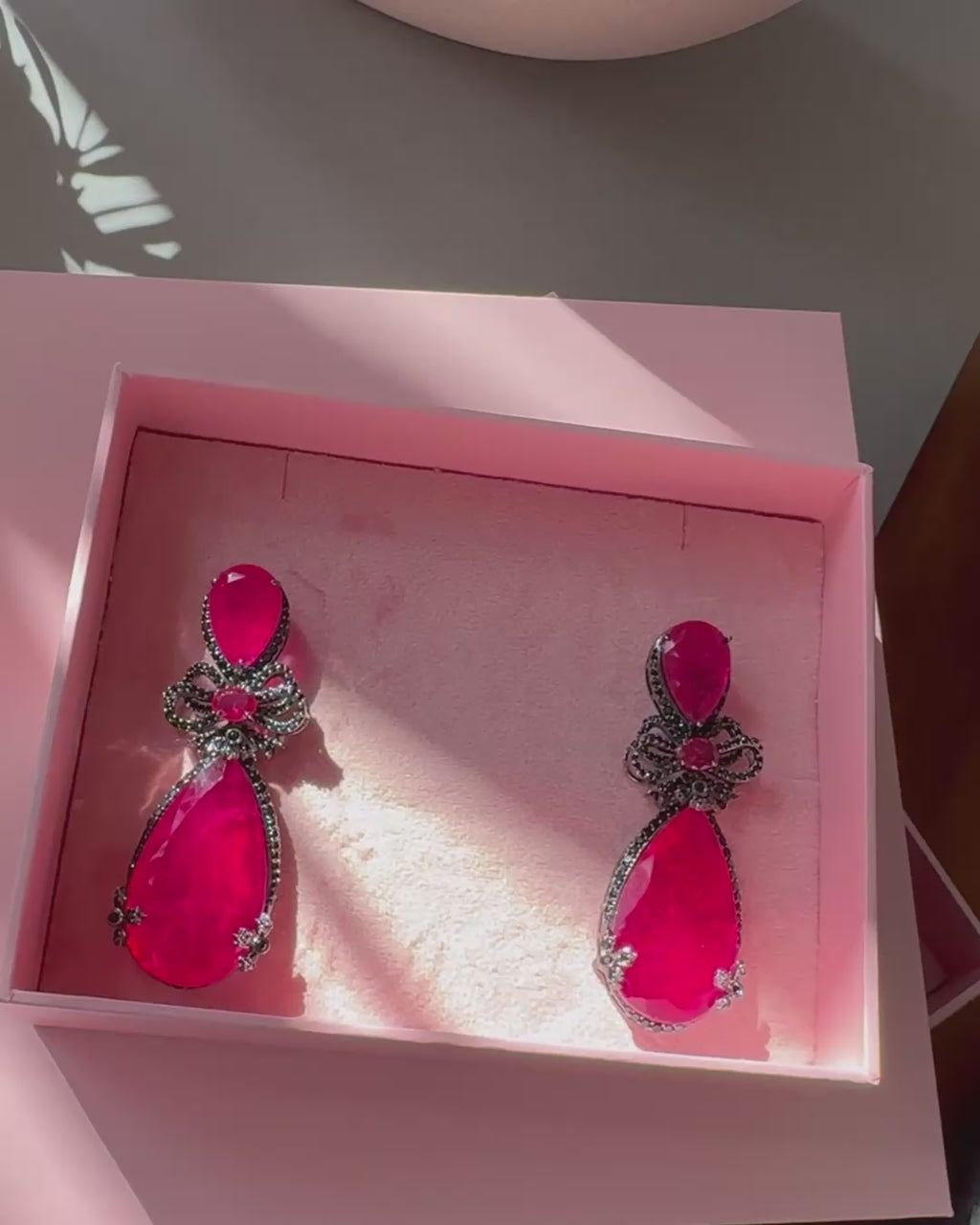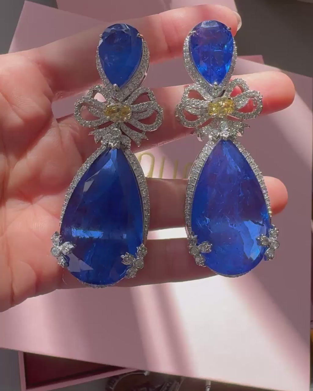 The Ivy Dangle Earrings exude refined grandeur with their enchanting teardrop silhouette in a vivid sapphire-blue hue. Framed with delicate CZ accents, each drop is crowned by an ornate bow motif adorned with a soft yellow center piece, creating a harmonious play of color and sparkle.