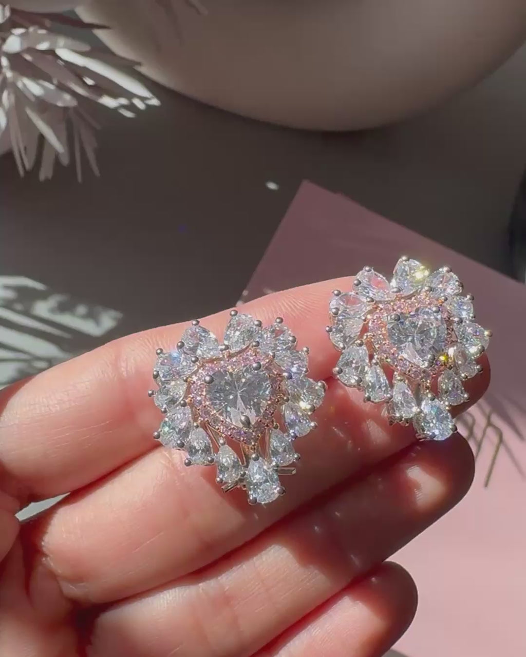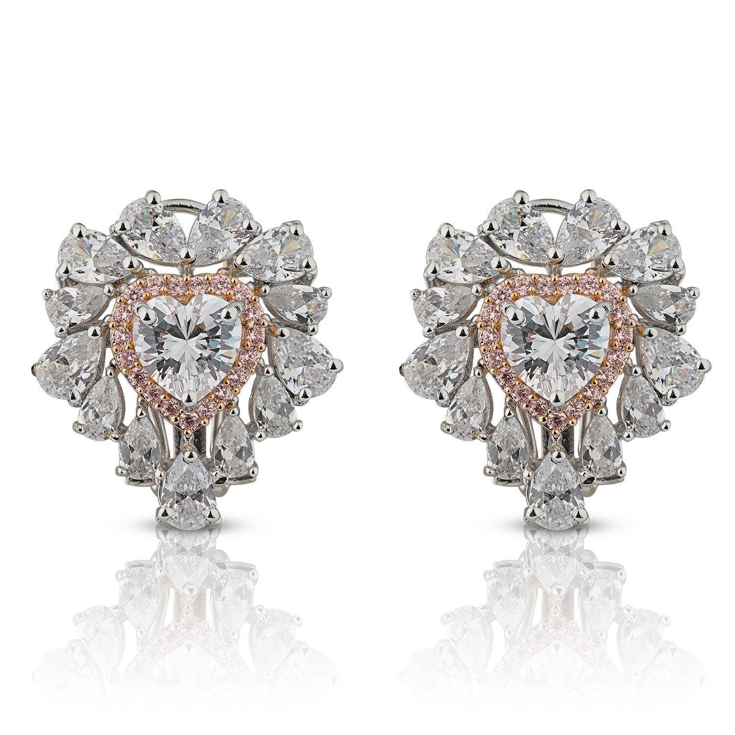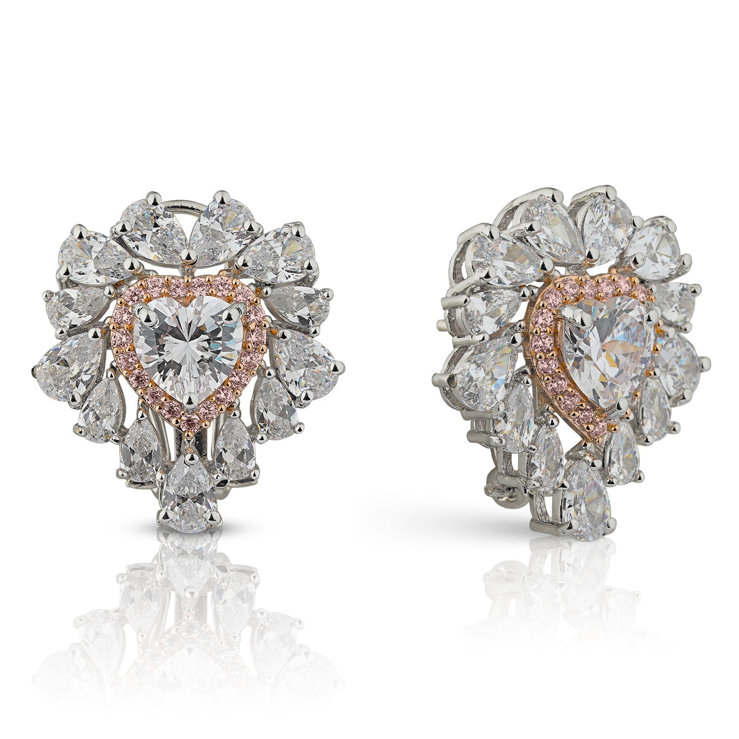 A celebration of timeless romance, the Juliette Stud Earrings feature heart-shaped CZ solitaires framed by a delicate halo of blush-toned brilliance. Surrounded by a symphony of pear-cut CZ stones that radiate light from every angle, these earrings exude elegance in their most refined form. Perfect for intimate moments and grand occasions alike, they are a graceful expression of love and luminosity.