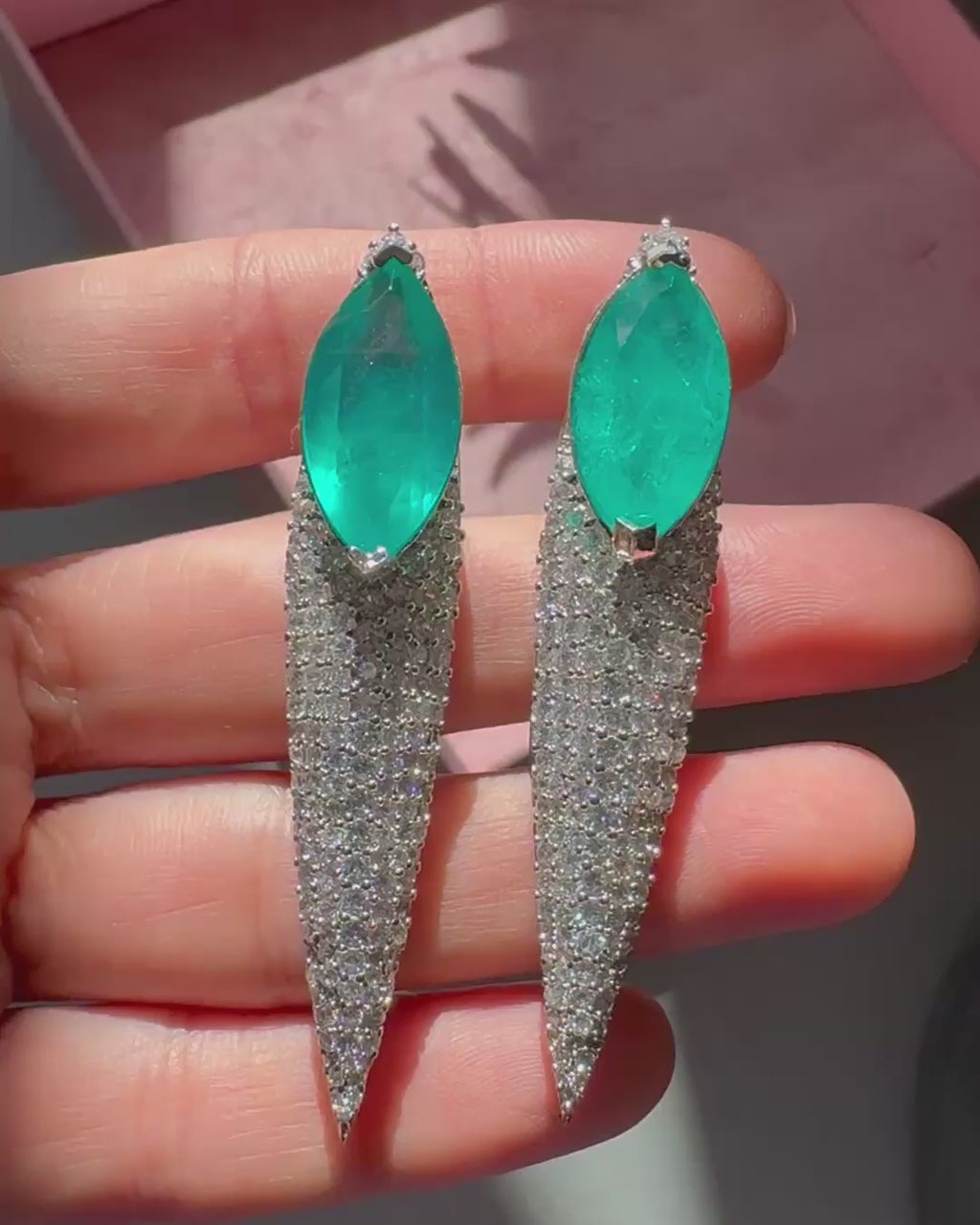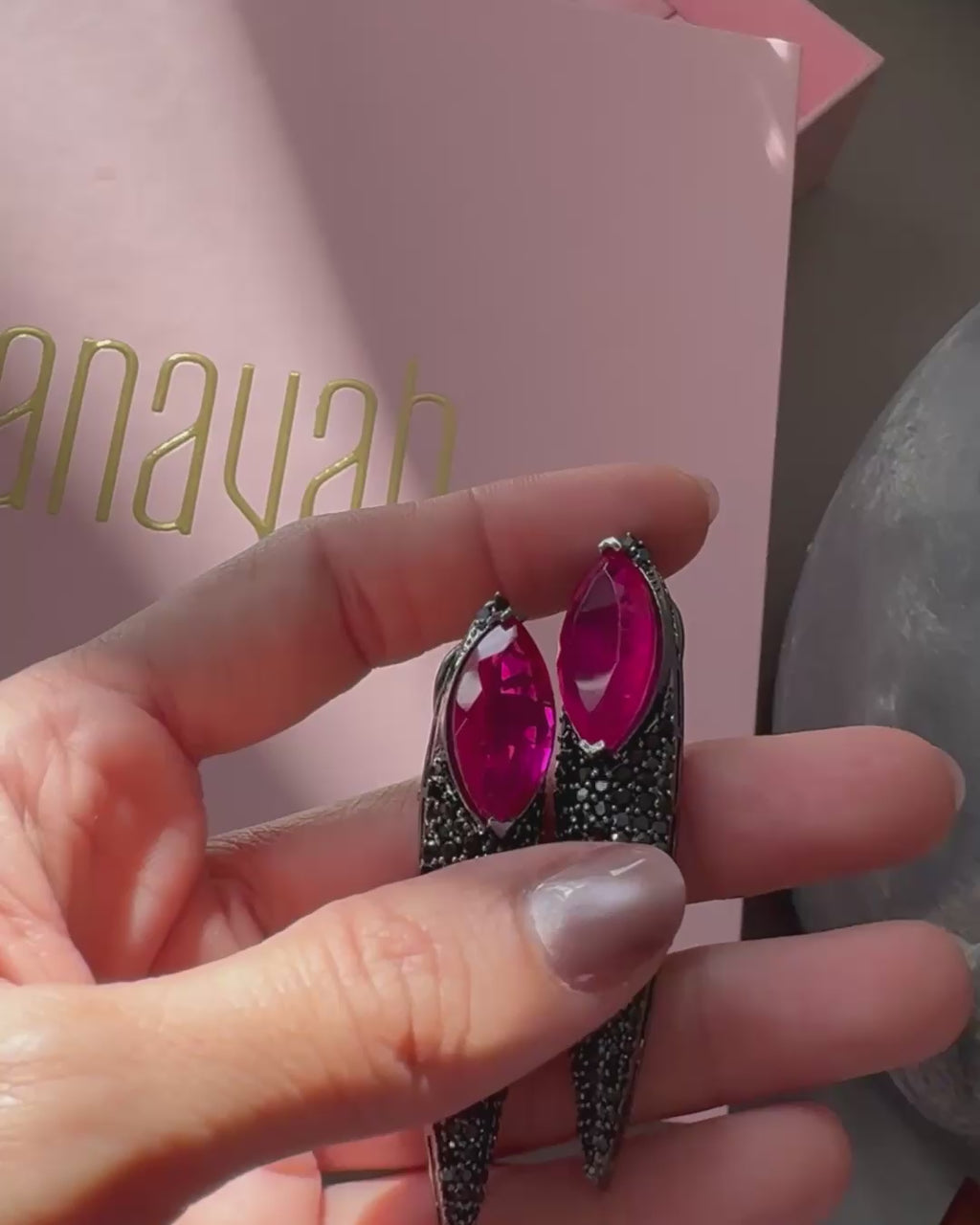 The Meher Earrings are a fearless statement of modern glamour. A vivid marquise-cut ruby-hued stone takes center stage, set against a cascade of black and gunmetal CZ stones that taper into a sleek, elongated silhouette. The contrast of fiery color and dark shimmer creates a piece that is dramatic, edgy, and unforgettable.