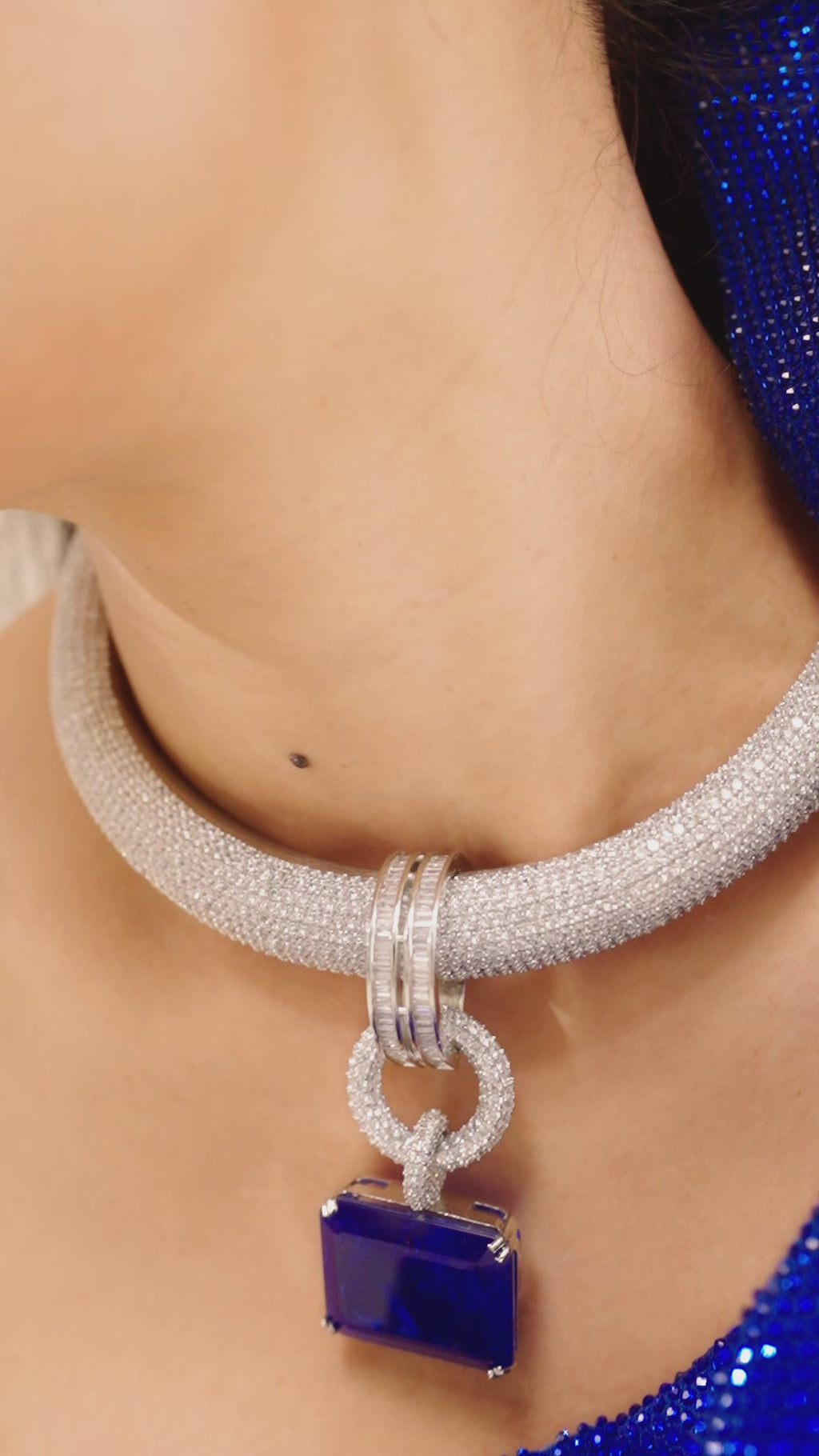 The Madelyn Necklace redefines statement luxury with its CZ collar shimmering in icy brilliance. At its heart, a radiant aquamarine-hued stone is suspended from sculpted circular links, framed with meticulous detailing. Elegant yet powerful, it captures a sense of modern regality, making it the ultimate piece for evenings of allure and sophistication.