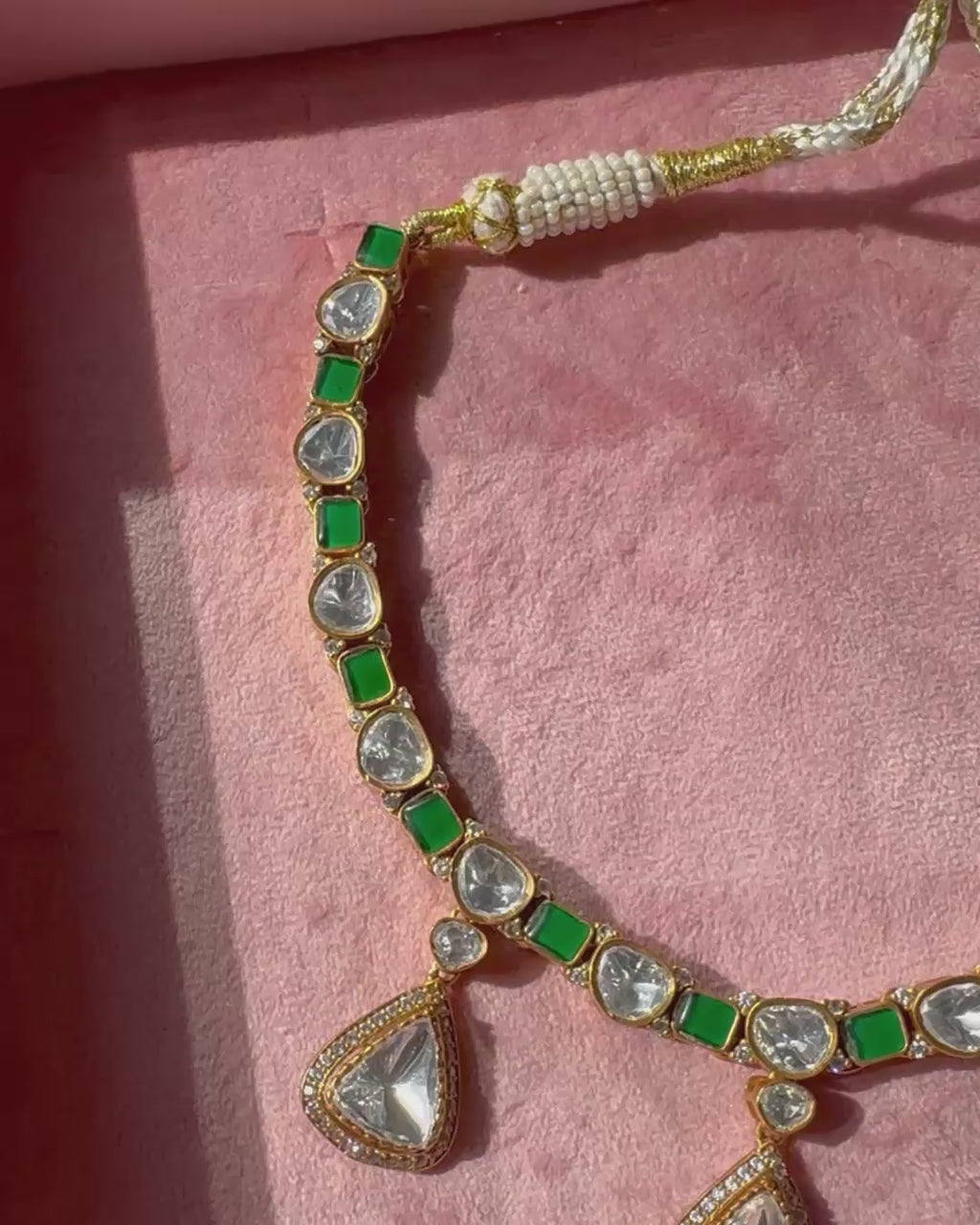 The Samaira Necklace Set exudes elegance with its stunning design and intricate details. Featuring vibrant ruby accents and shimmering drops, this set is perfect for weddings, festive celebrations, or glamorous evenings.