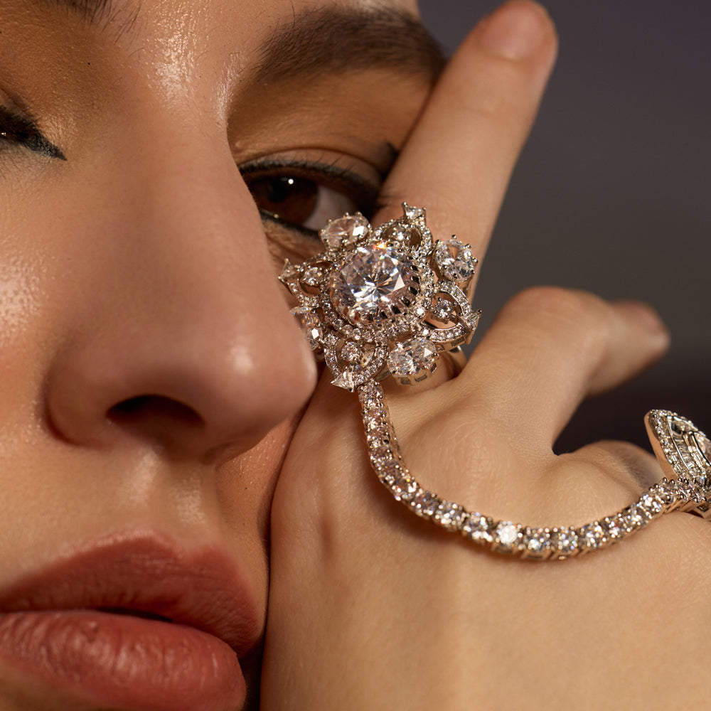 Dramatic and undeniably striking, the Damira Ring is a masterpiece of sculptural brilliance. A bold floral-inspired cluster of precision-cut CZ stones forms the centrepiece, radiating depth and luminous sparkle. Extending gracefully from the ring, a delicate crystal-studded chain drapes across the finger, adding movement and contemporary edge to its couture silhouette.