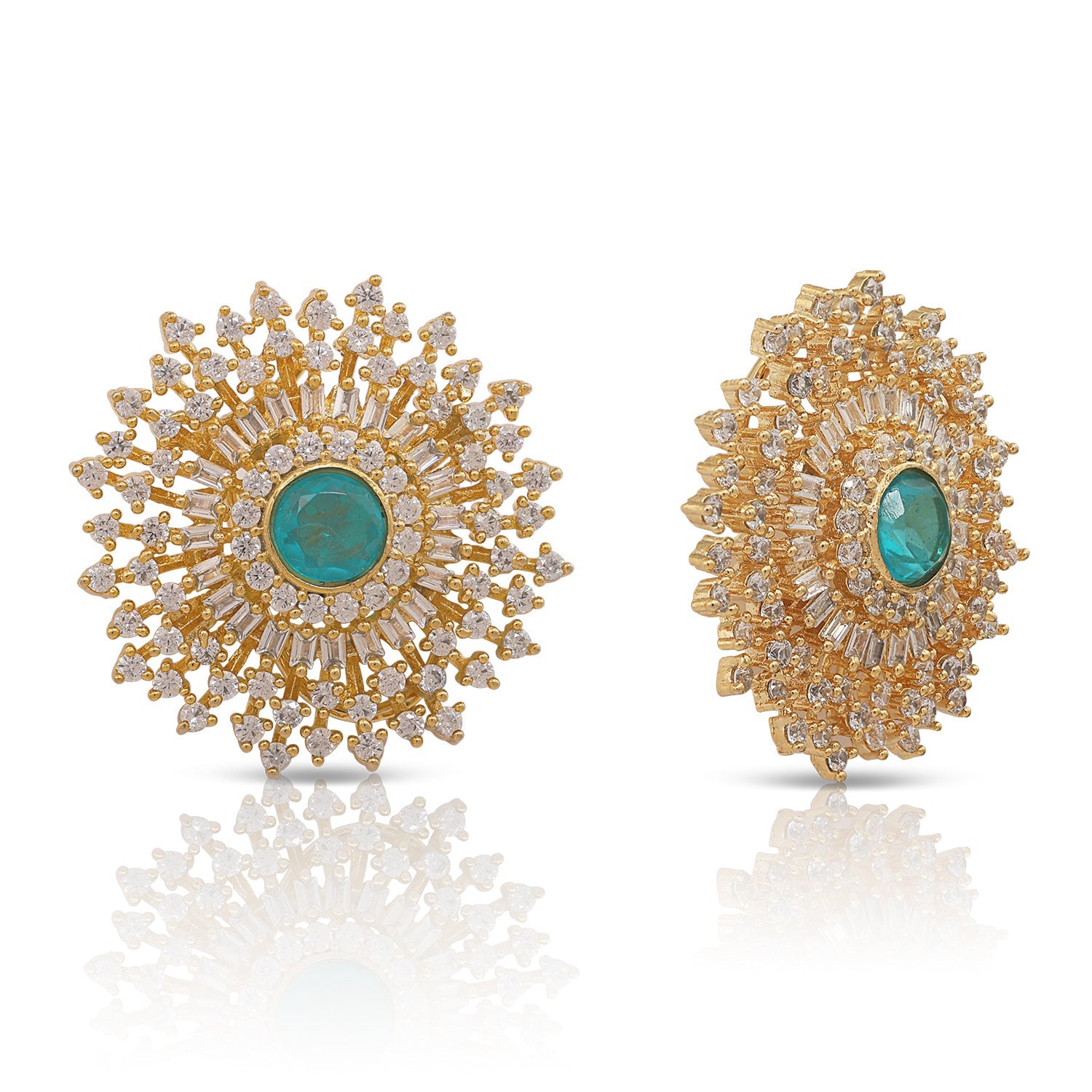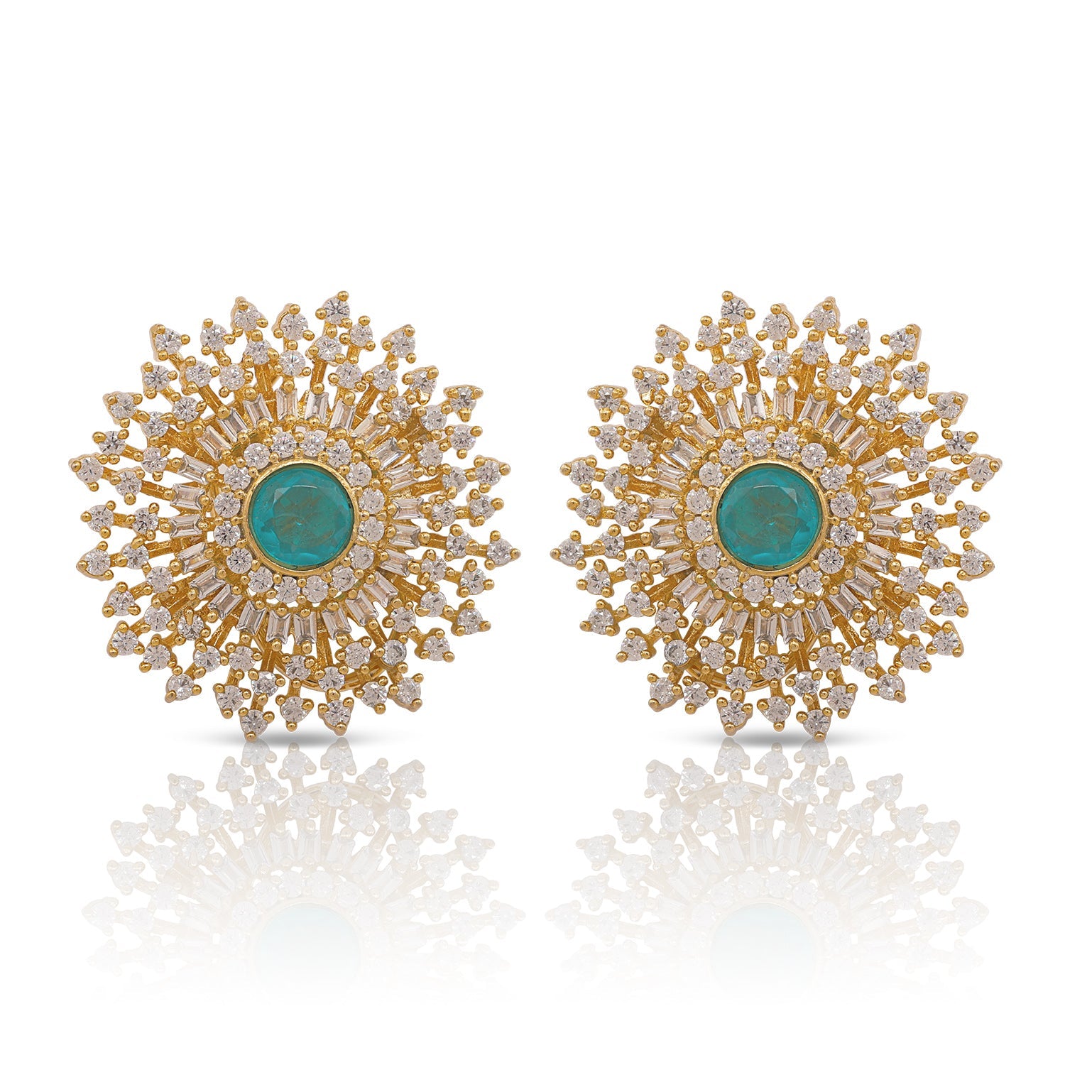 Delicate yet radiant, the Zayra Stud Earrings are inspired by blooming florals and intricate craftsmanship. An emerald-toned centre stone anchors the design, surrounded by finely set crystals arranged in a luminous sunburst pattern. The textured gold setting enhances the brilliance, creating a piece that feels both regal and refined.