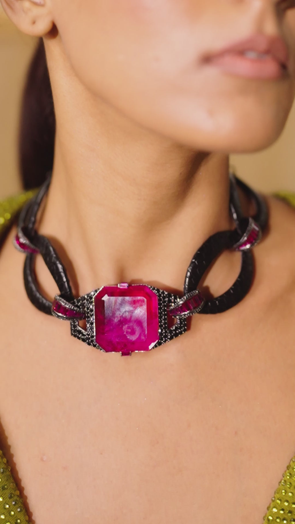 The Kalista necklace is a bold yet poetic expression of power and allure. At its heart lies a commanding ruby-hued emerald-cut stone, framed with accents of black crystals that shimmer like midnight skies. The sculpted black links, textured to perfection, weave strength with elegance, while ruby baguette details offer a flash of passionate brilliance at every glance.