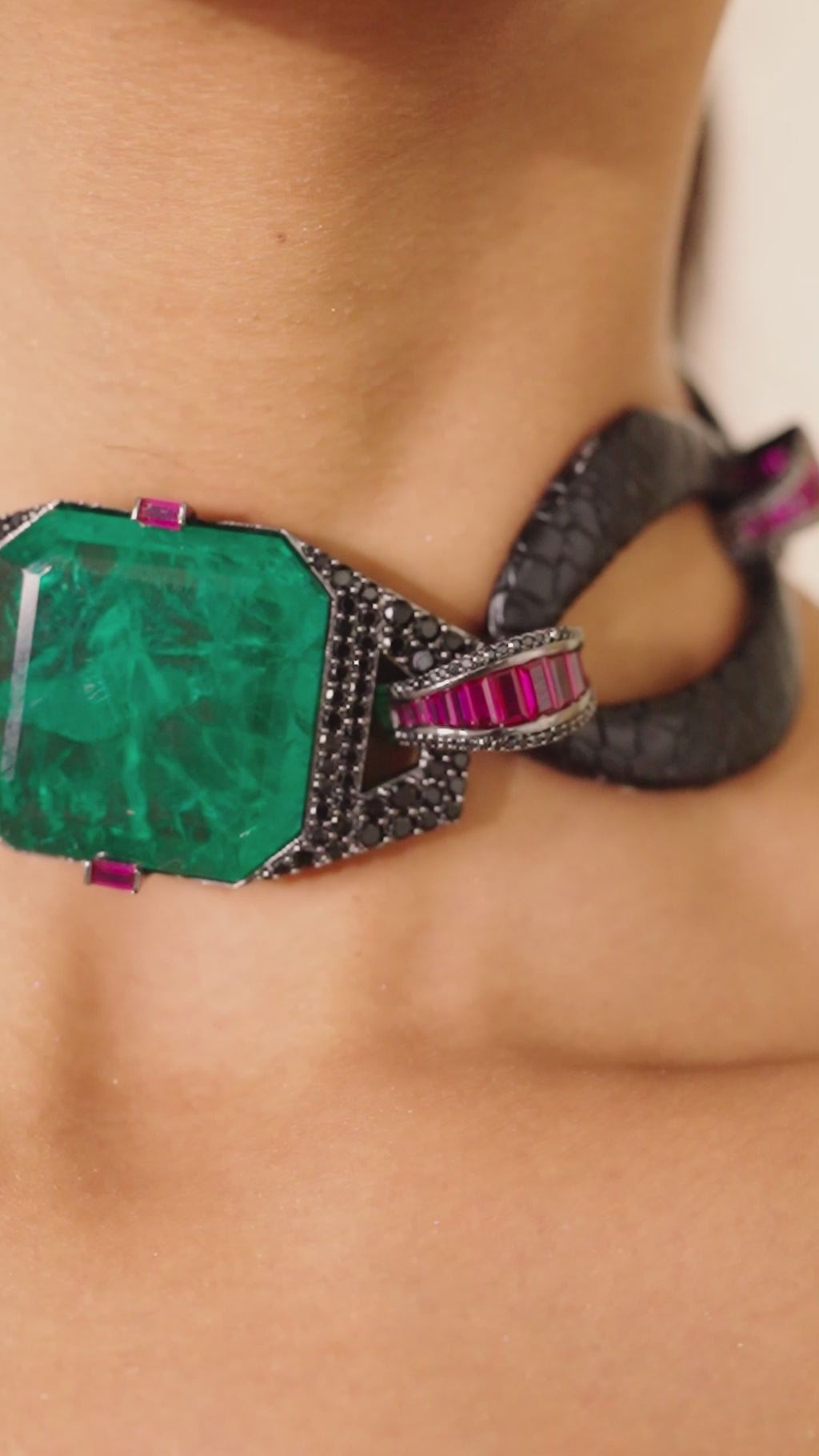 The sculptural links, finished in a textured black setting, echo strength and individuality, while the luminous centerpiece brings in timeless elegance. A jewel that embodies power and passion, Kalista is not for the faint of heart — it is for the woman who writes her own story.