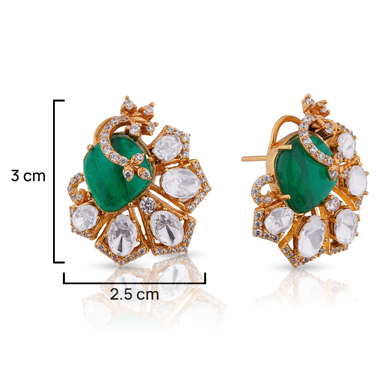 Unleash regal charm with the Akriti - Emerald Green Peacock Studs, designed to reflect opulence with every angle. The bold green enamel heart forms the center of an ornate peacock, complemented by radiant kundan-style stones set in a rich antique gold finish. Delicate cubic zirconia embellishments enhance the grace of the design, making it a striking choice for all celebrations.
