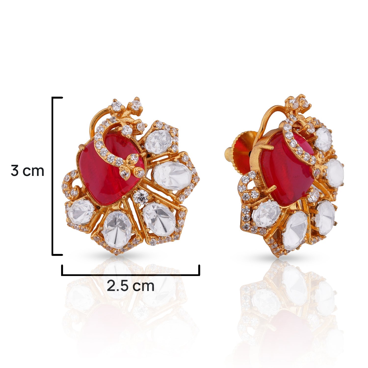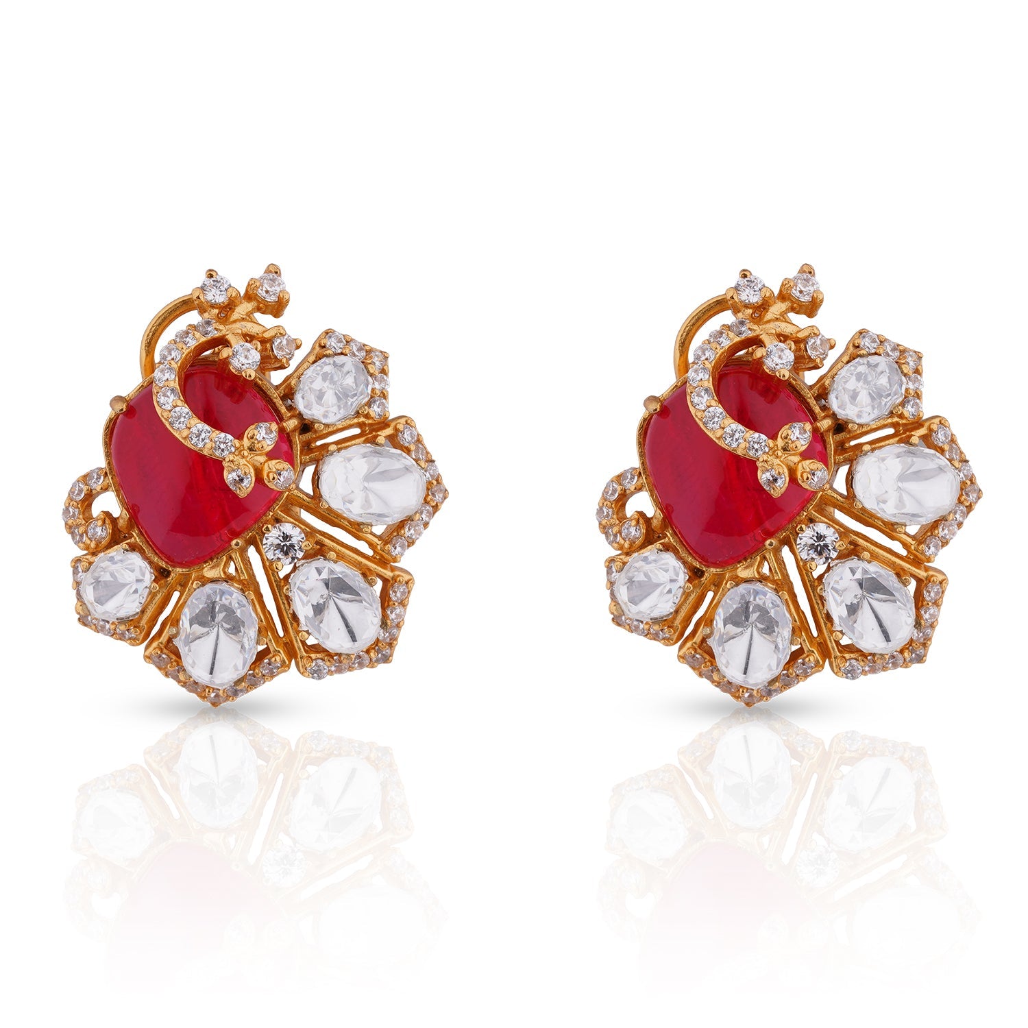 Make a bold statement with the Akriti - Peacock Royale Studs, where regal charm meets artistic craftsmanship. Designed in the shape of a majestic peacock, these earrings feature a heart-shaped ruby-red enamel center, encircled by kundan-inspired clear stones that glisten in a rich, antique gold-plated setting. The peacock’s crest and plume are delicately detailed with Cubic zirconia, adding a dazzling flourish.