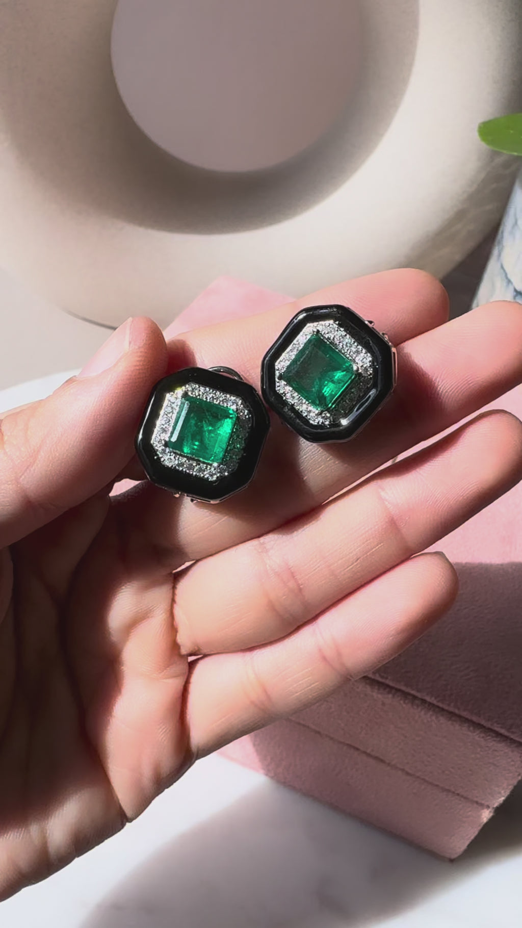Add a touch of elegance to any outfit with our Hira earrings! Featuring a stunning emerald green center stone, outlined with sleek black enamel and finished with sparkling cubic zirconia . These earrings exude sophistication and style.