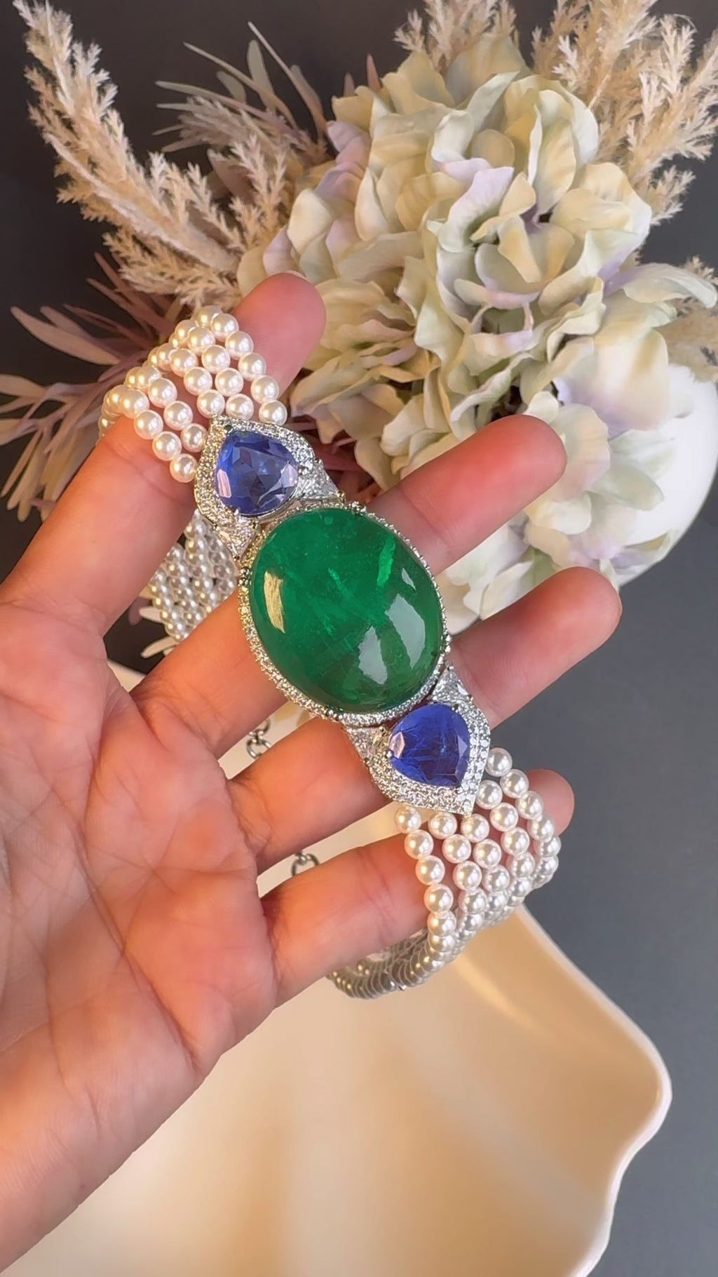 This pearl choker is an essential addition to your collection, showcasing an emerald green doublet at the centre flanked by blue doublets. It comes with perfectly matching studs to complete the look.