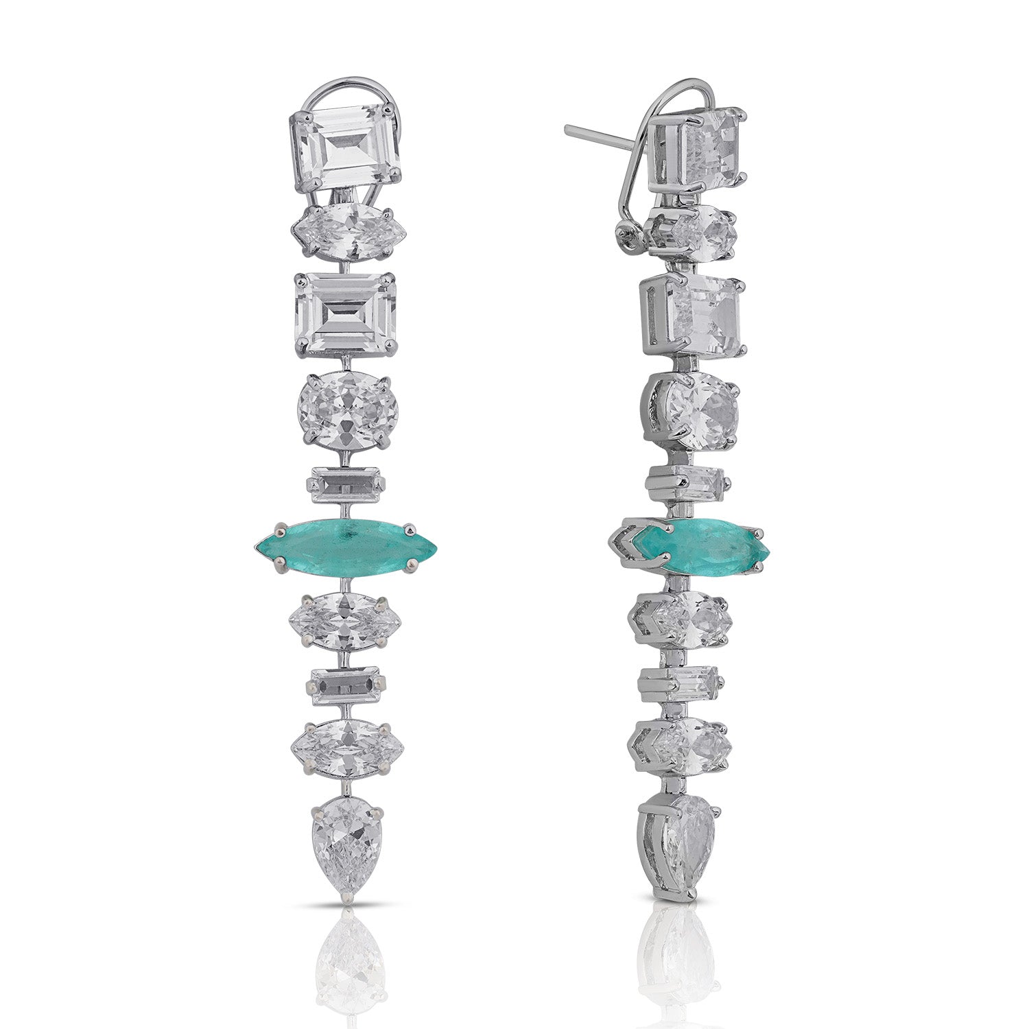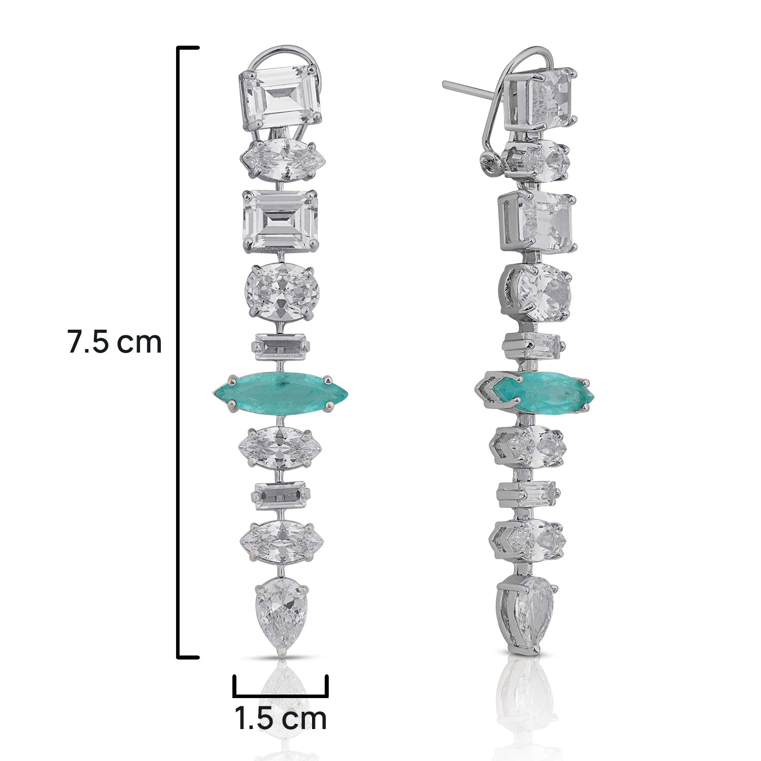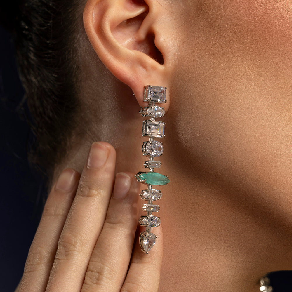 A refined vertical composition of brilliance and balance, the Dalia Dangle Earrings are crafted for the woman who loves understated drama. A seamless sequence of emerald-cut, marquise, and brilliant CZ stones creates a fluid line of light, punctuated by a striking aqua marquise at its center.