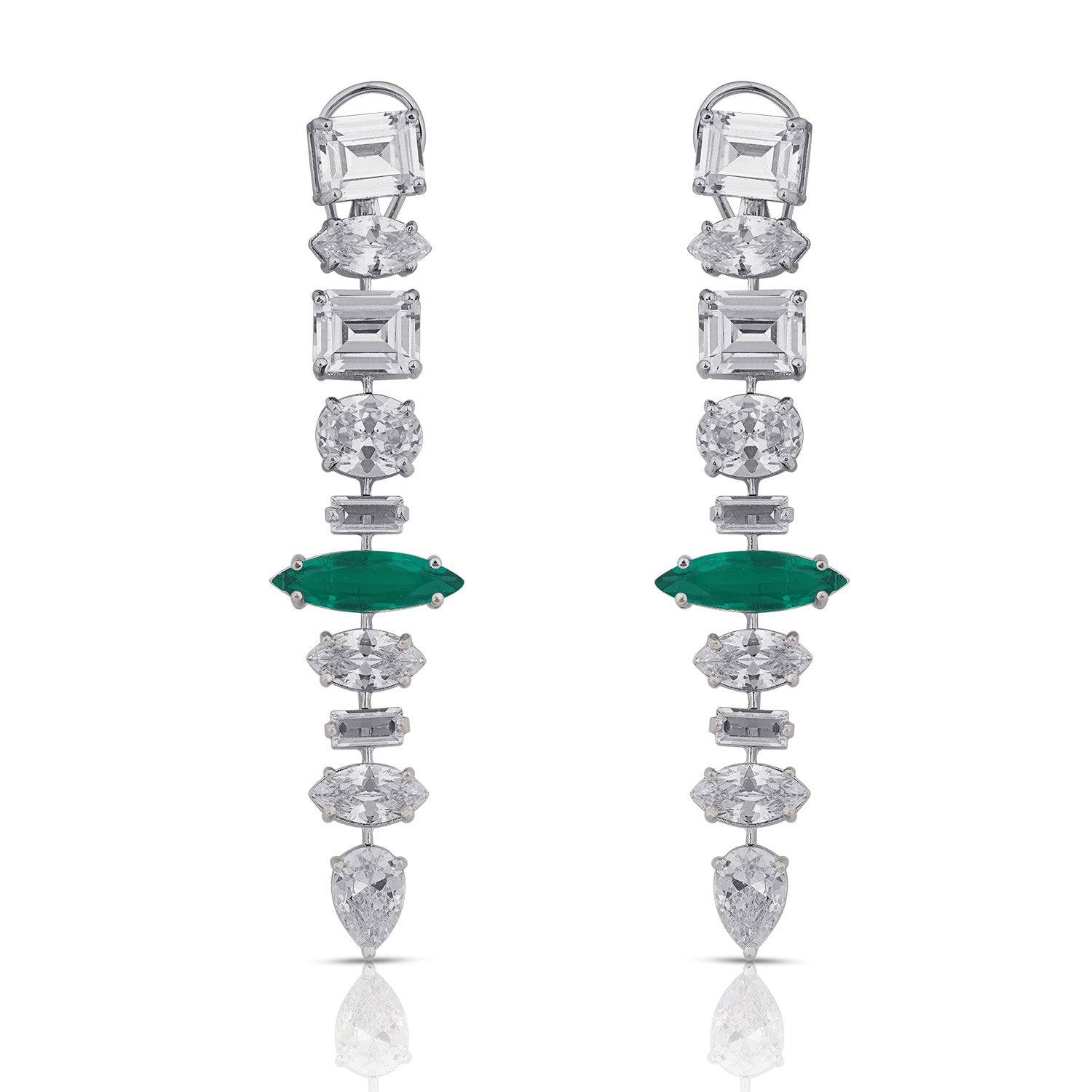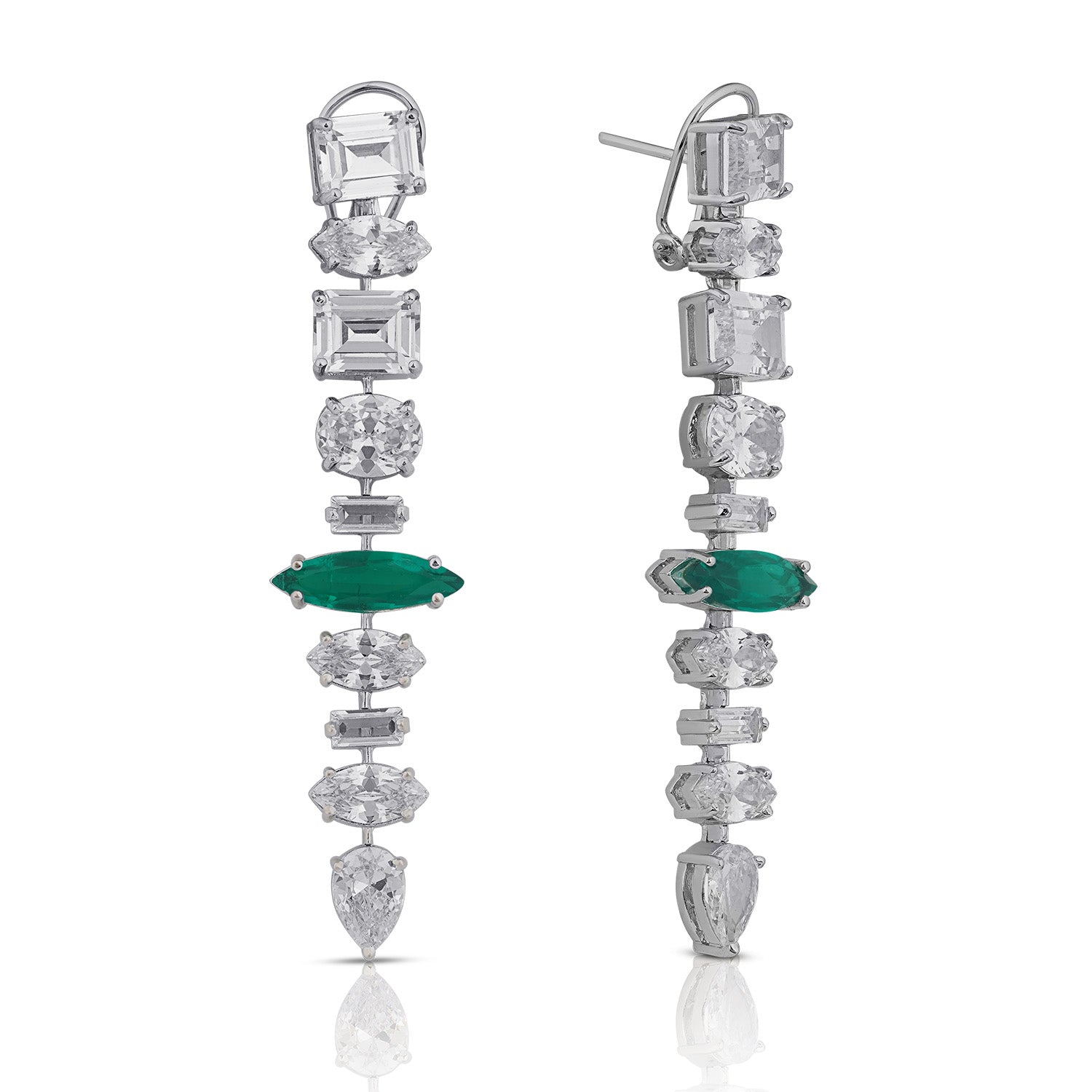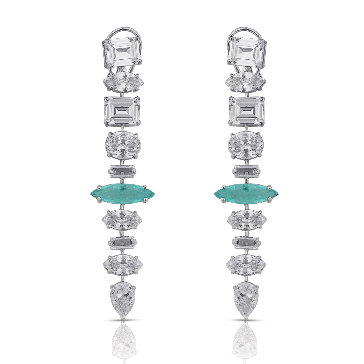 A refined vertical composition of brilliance and balance, the Dalia Dangle Earrings are crafted for the woman who loves understated drama. A seamless sequence of emerald-cut, marquise, and brilliant CZ stones creates a fluid line of light, punctuated by a striking aqua marquise at its center.
